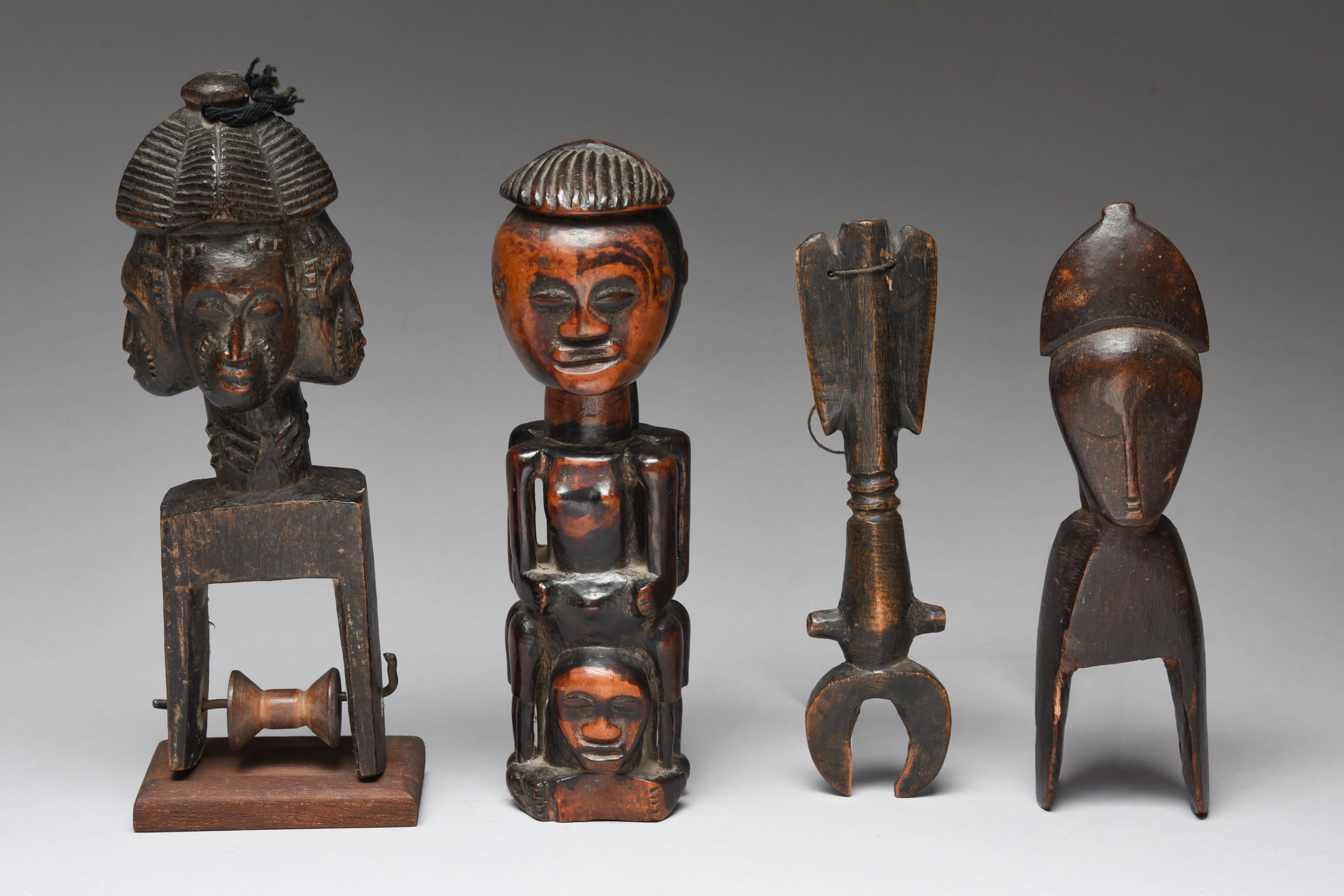 a Jimini heddle pulley, 22.5cm high, an Ivory Coast heddle pulley with four heads, 25cm high, on a stand and a Mossi whistle, 21.5cm high. (5)