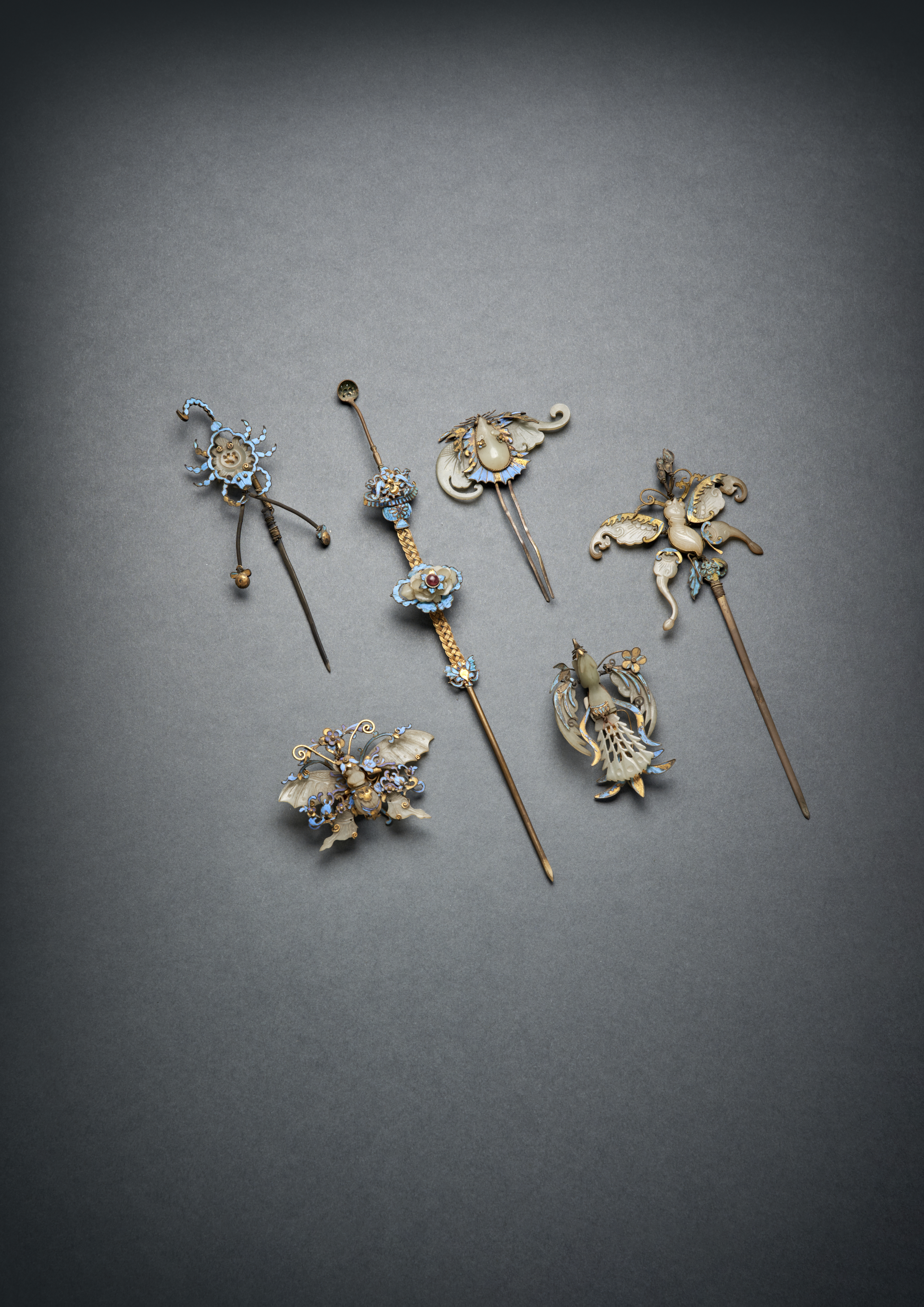 Variously shaped as butterfies, a bat, a scorpion, a phoenix, one decorated with floral designs, each embellished with pale celadon jade and kingfisher feathers, 25.5cm max. (6)
