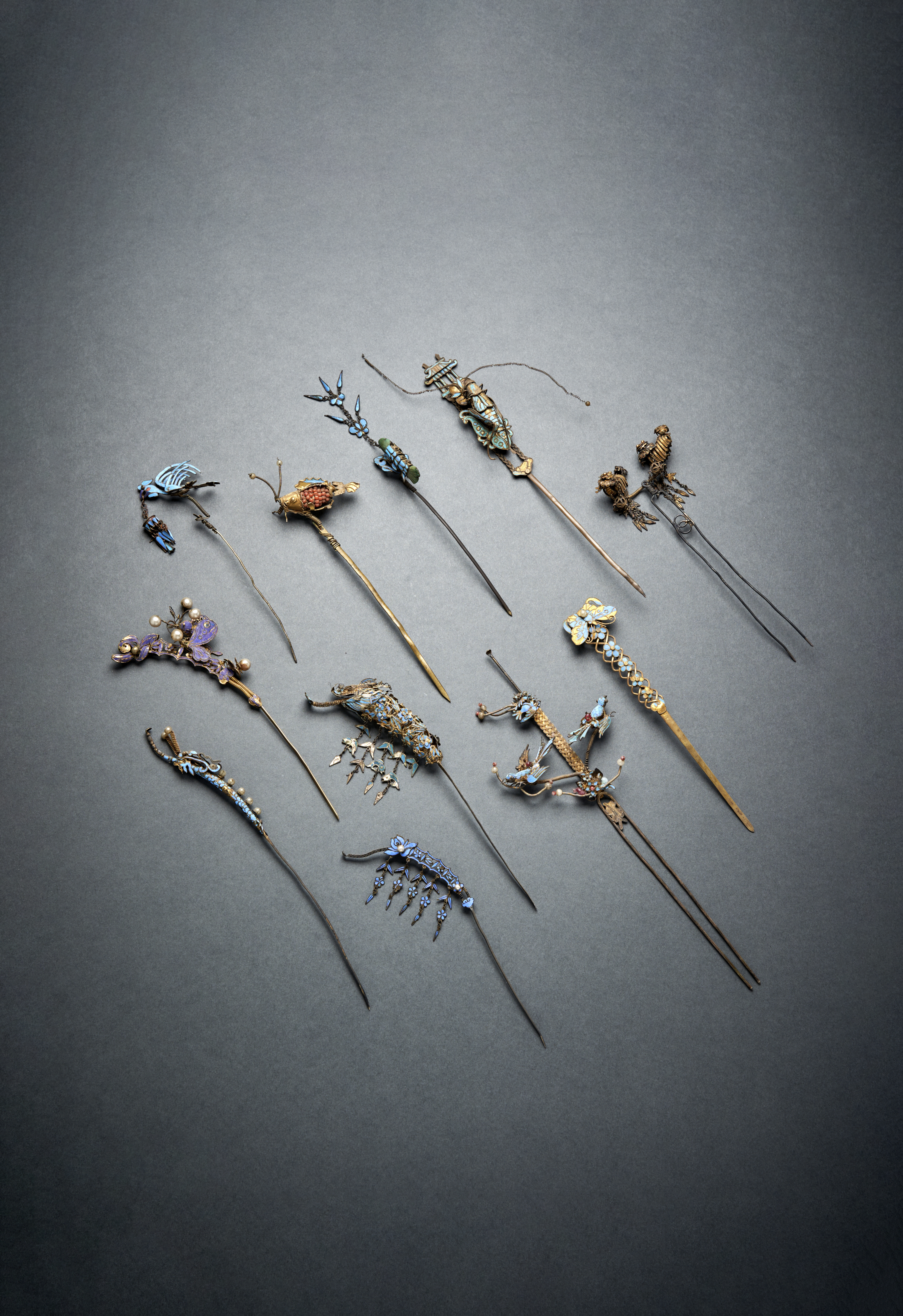 ELEVEN CHINESE GILT-METAL AND KINGFISHER FEATHER HAIRPINS