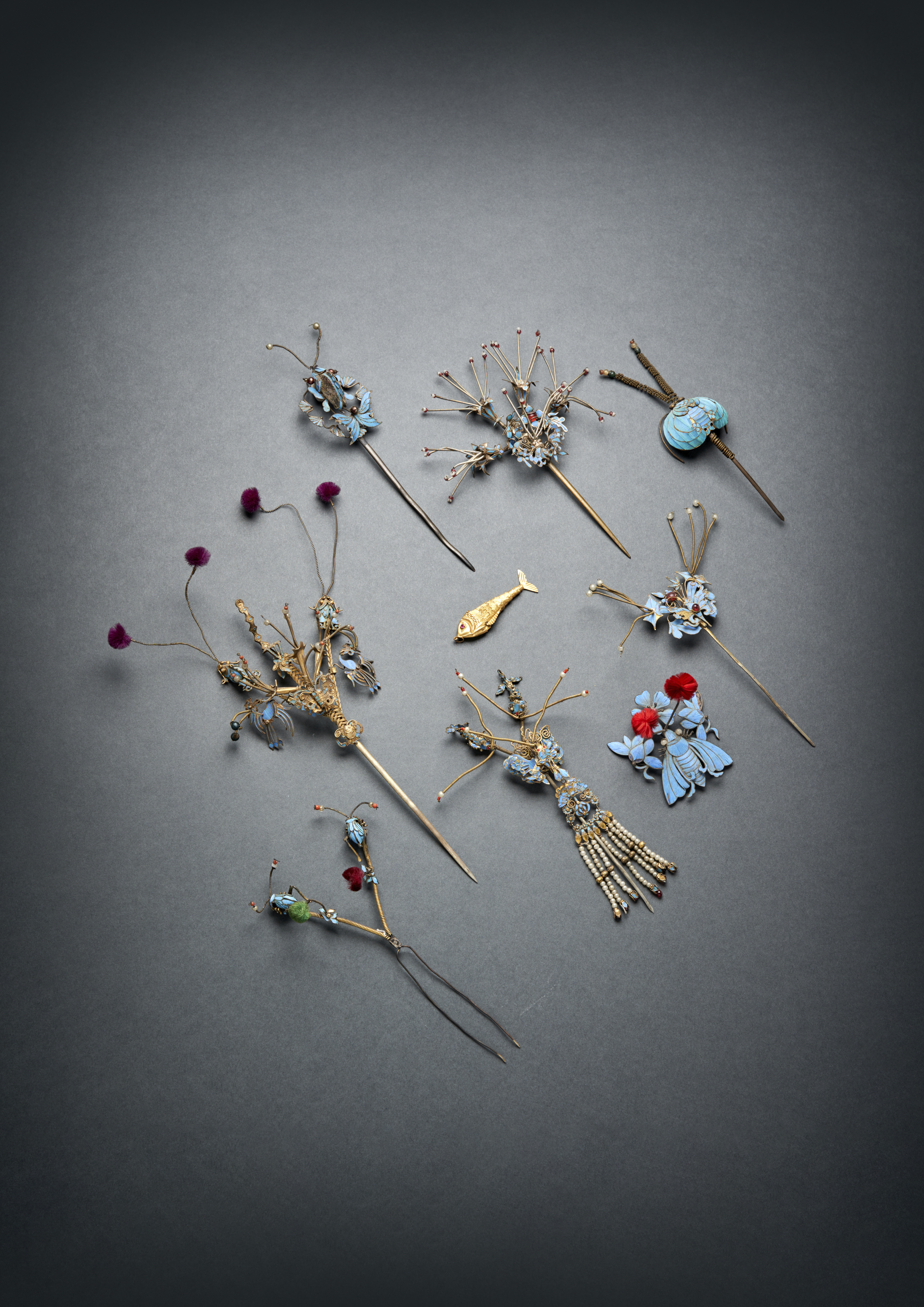 Variously formed in gilt-metal and filigree, comprising: four hairpins depicting butterflies, insects and floral motifs, one elaborately constructed with designs of fish, butterflies, mythical beasts and auspicious symbols, one depicting two crickets, one formed as a beetle, and a gilt metal articulated fish pendant, variously embellished with strands of simulated pearls, pom poms, coloured stones and beads, one with a paper label for Jehanne de Biolley, Oriental Art, London, 25.8cm max. (9)