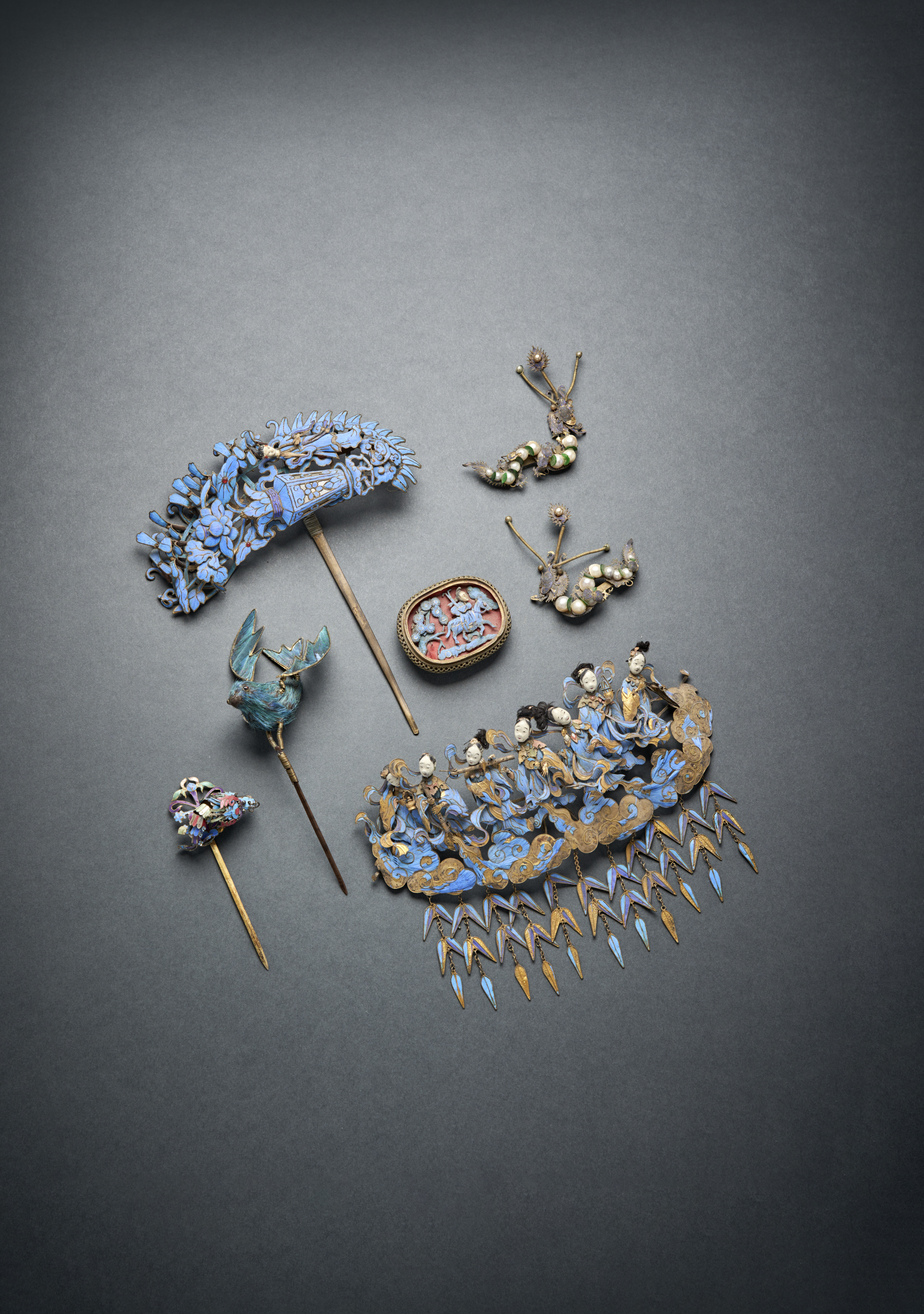 Comprising: an oval plaque depicting seven deities with their attributes above swirling clouds and strands of stylised bamboo leaves, three hairpins, one depicting a goddess standing next to a vase and a crane, one modelled as a bird, one decorated with an articulated dragon, a pair of dragon brooches, and a plaque with a scholar on horseback, variously adorned with kingfisher feathers, gilt metal and filigree, simulated pearls, and coloured hardstones, 20cm max. (7)