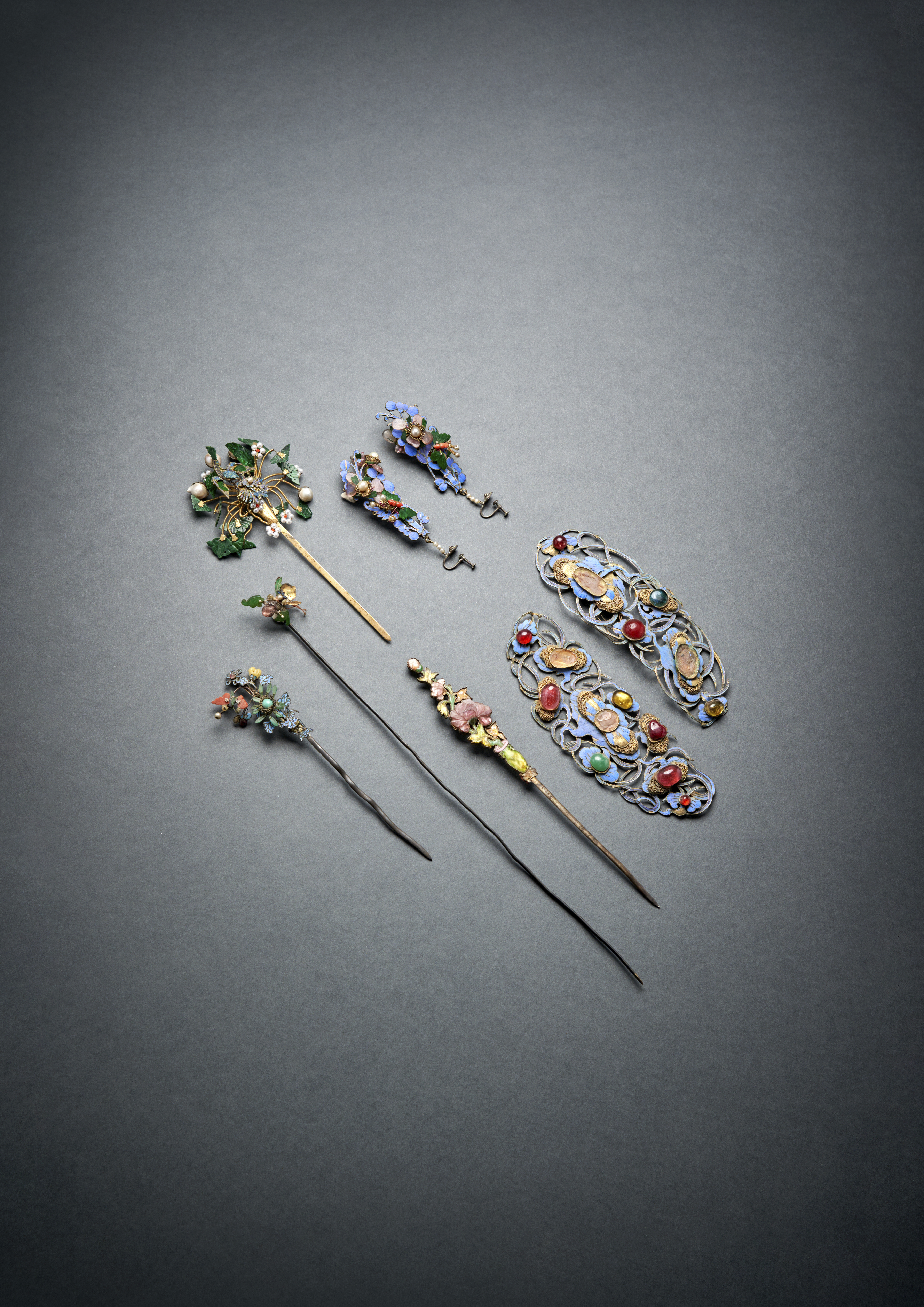 Comprising: a pair of plaques with filigree floral designs, a pair of earrings and four hairpins, variously decorated with butterflies perching on flowering sprays, and a bat, adorned with kingfisher feather, jadeite, coral, coloured hardtones and simulated pearls, together with a hairpin set with hardstones, 30.3cm, max. (8)