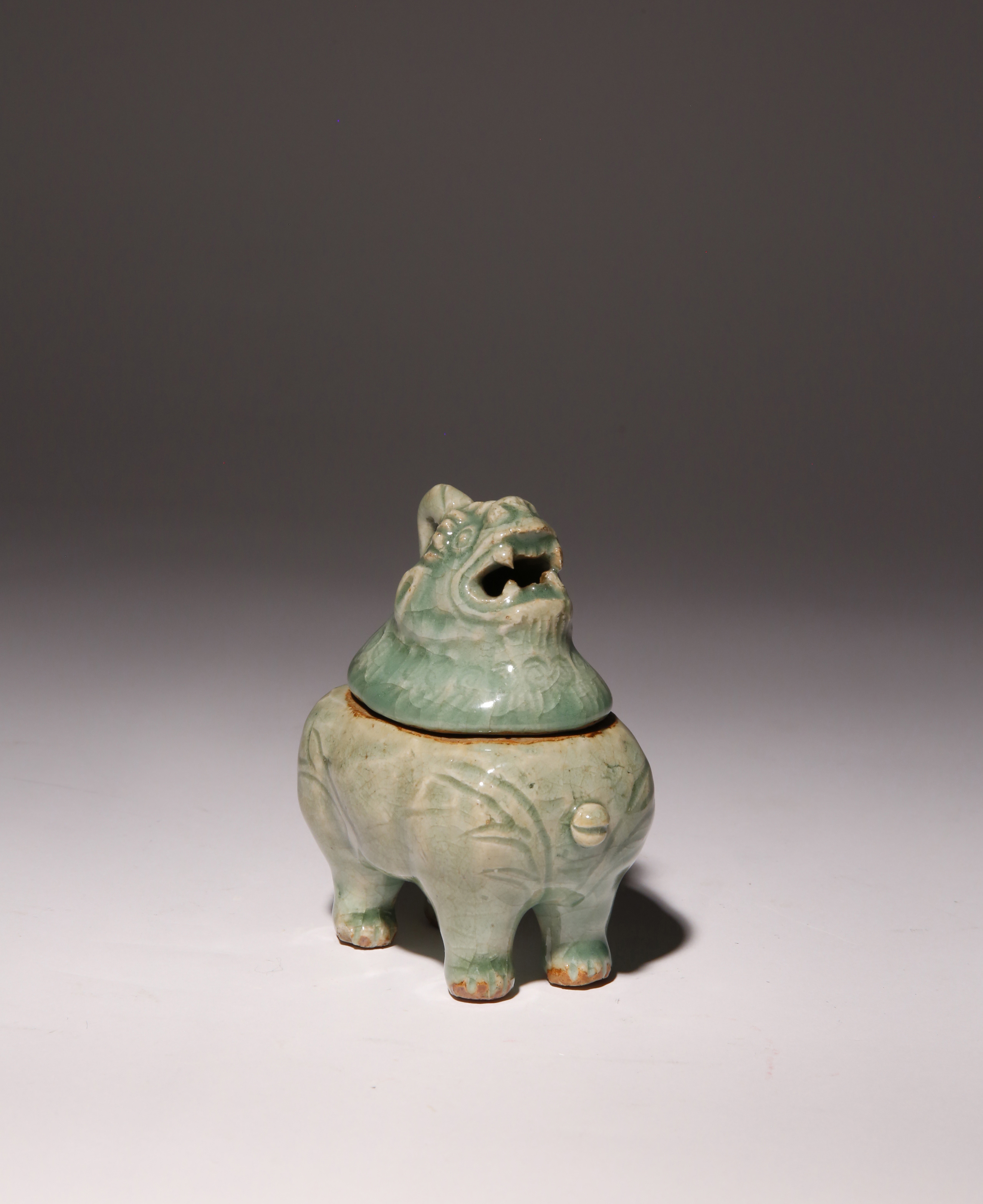A SMALL CHINESE LONGQUAN CELADON LUDUAN INCENSE BURNER AND COVER