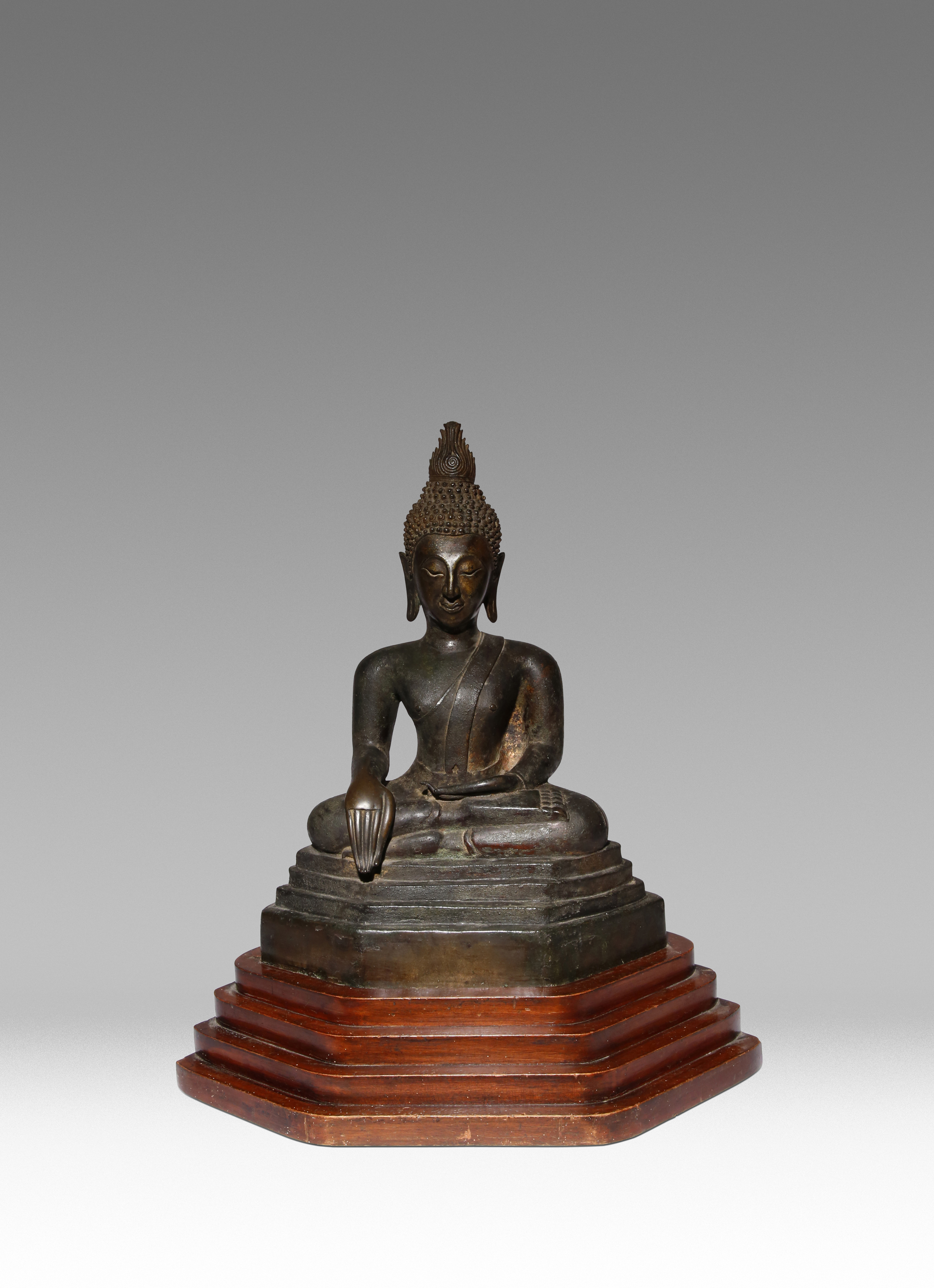 Seated on a high stepped plinth in dhyanasana, he holds his left hand upon his lap in dhyana mudra and touches the ground with his right hand in bhumisparsha mudra, wearing a samghati, his hair in tight curls rising to the ushnisha surmounted by a flame, a wood stand, 15kg, 54cm, (55cm overall). (2)