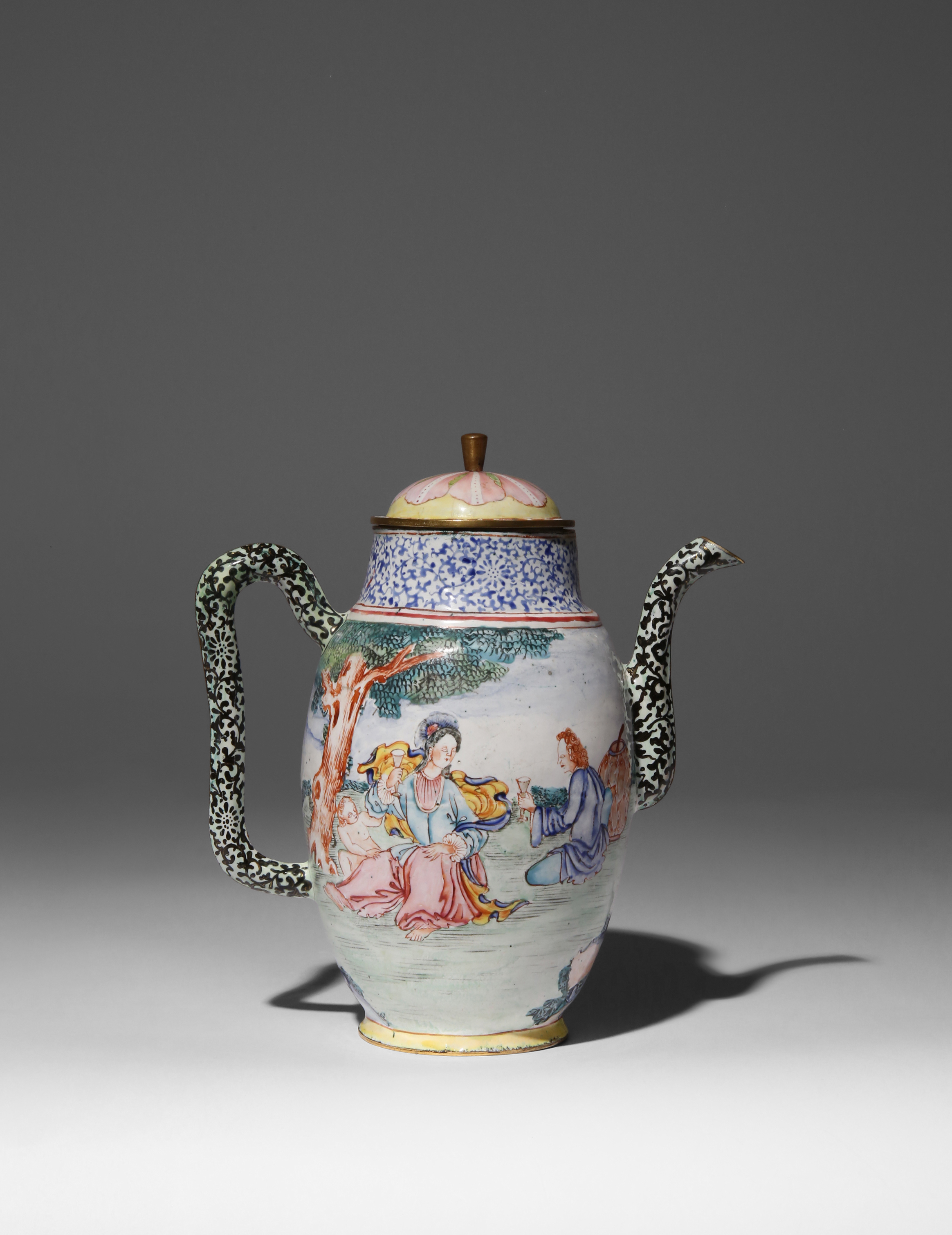 A CHINESE CANTON ENAMEL EUROPEAN SUBJECT EWER AND COVER