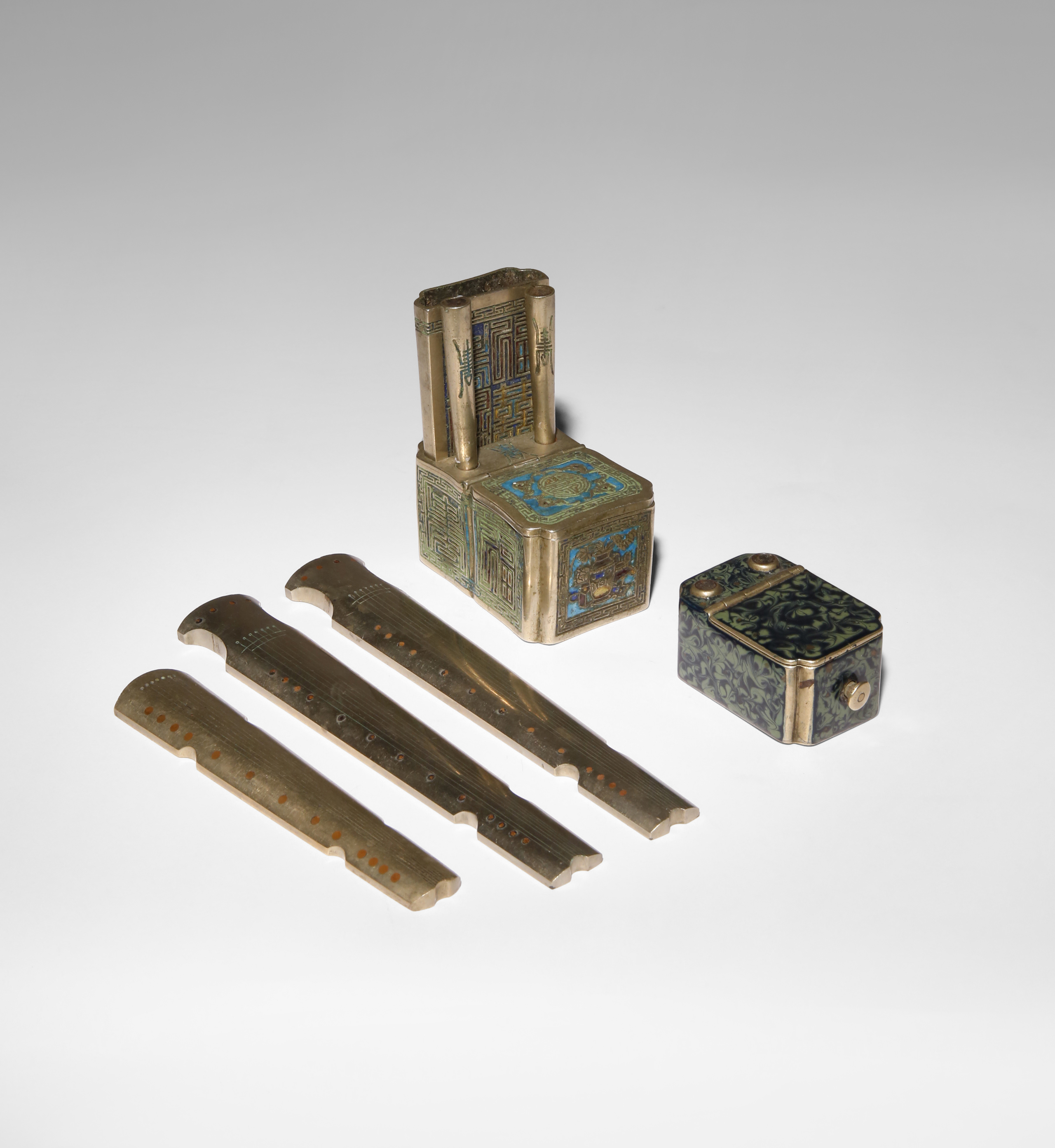 Each shaped as a qin, together with two baitong and enamel ink wells, one with removable compartments, one inscribed fu xi shou lu, 976g overall, 17cm. (8)
