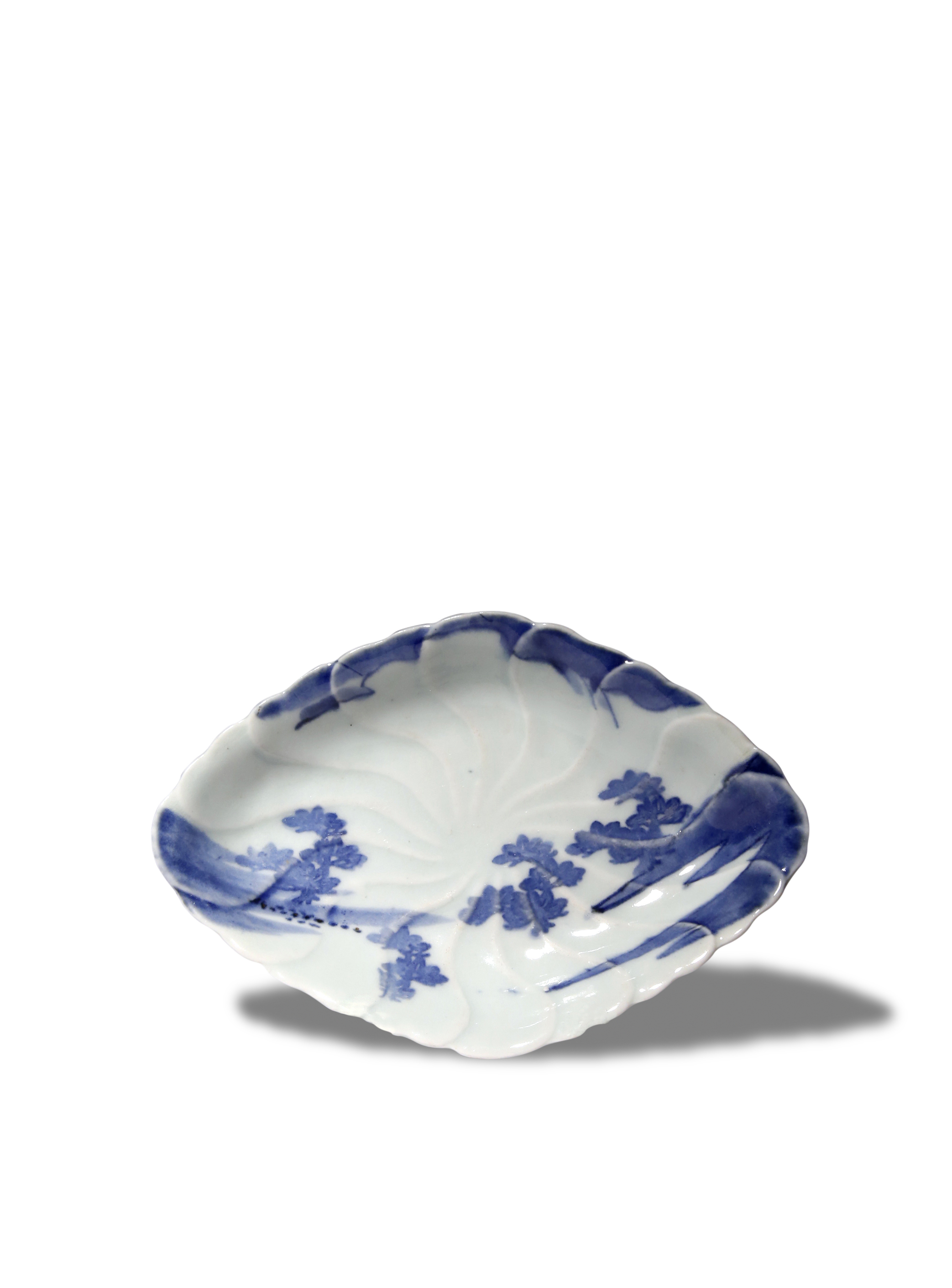 A SMALL JAPANESE ARITA BLUE AND WHITE MOULDED DISH (MUKOZUKE)