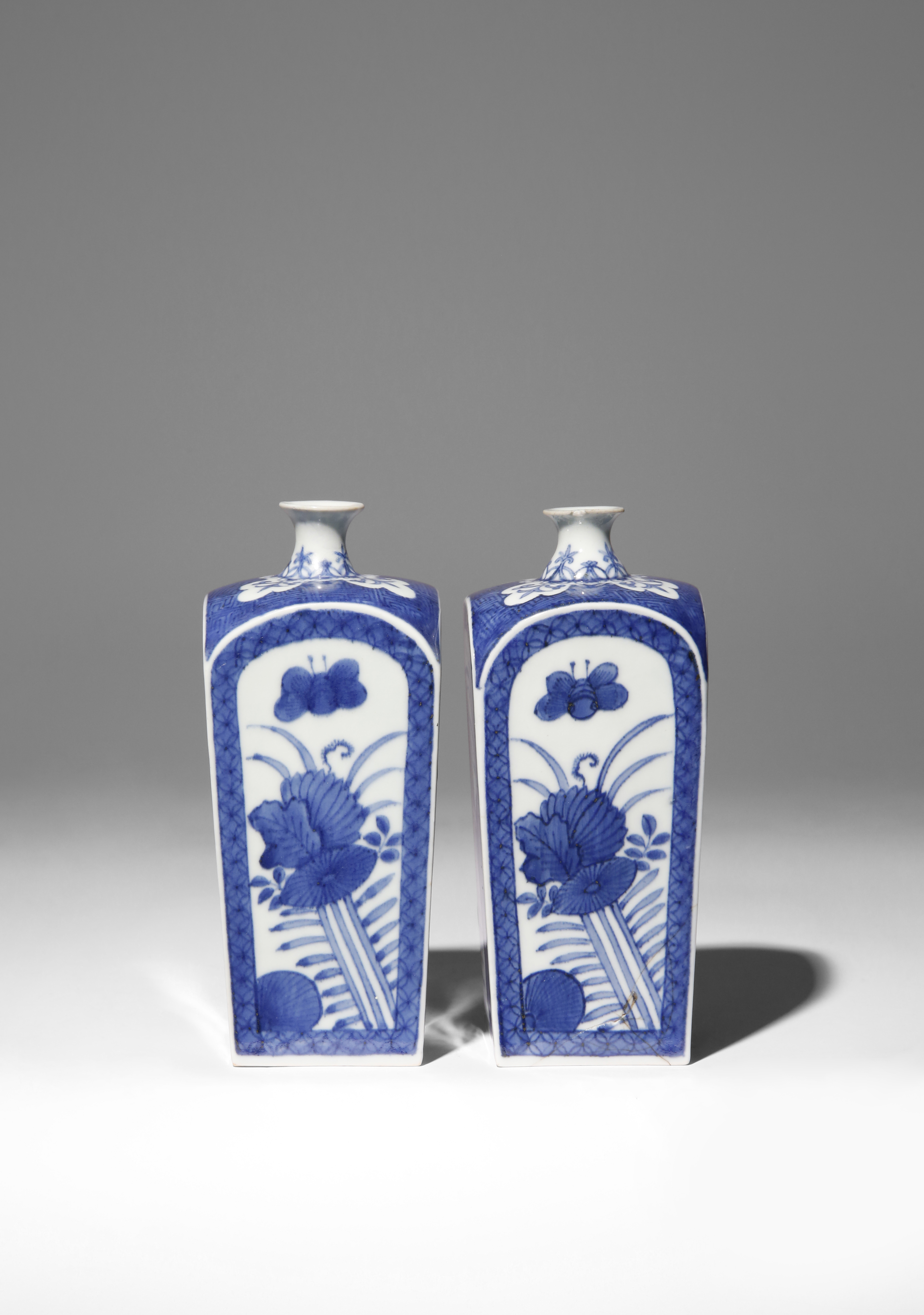 A PAIR OF JAPANESE BLUE AND WHITE SAKE BOTTLES (TOKKURI)
