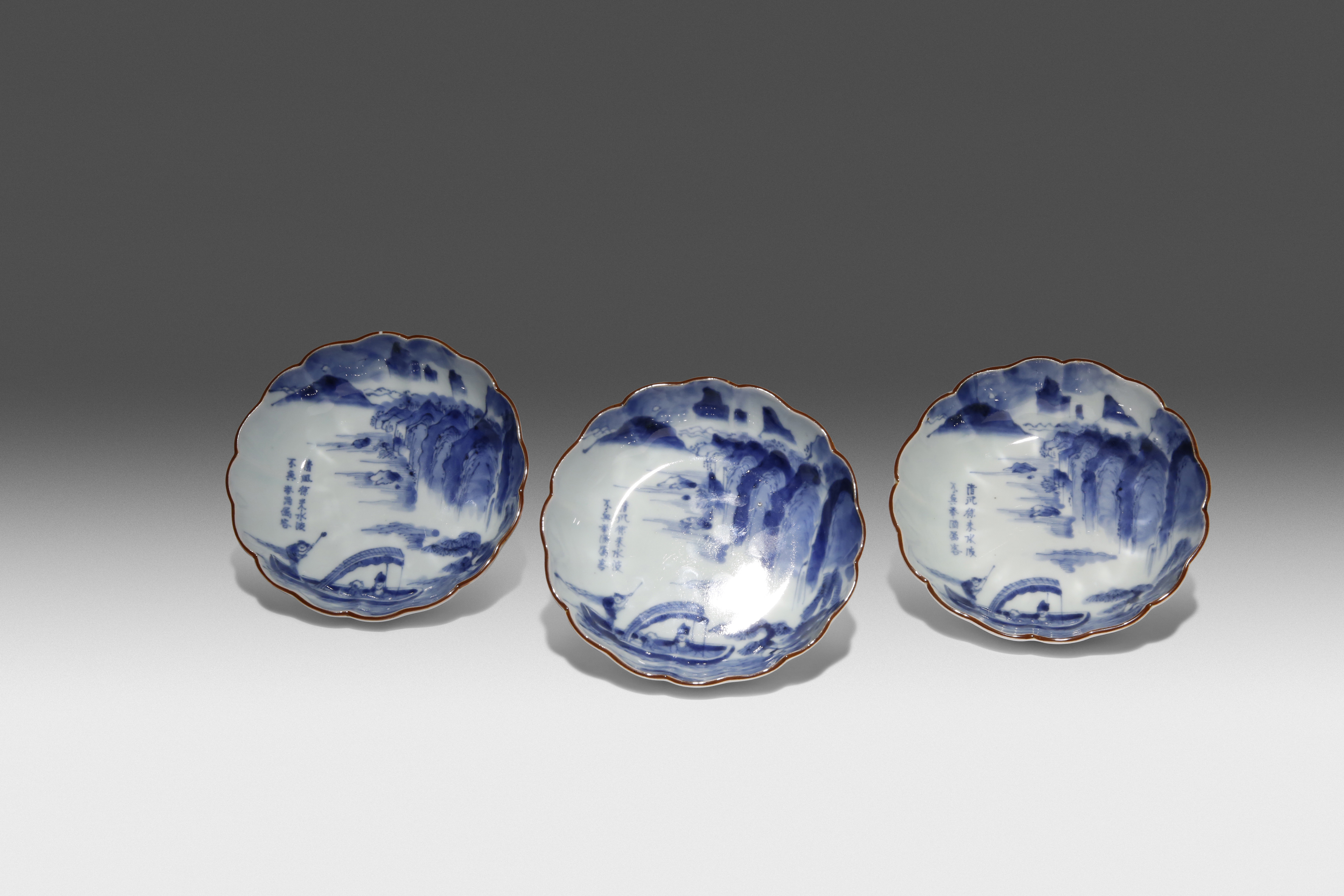 All three with a scalloped rim and brown-painted edge, each decorated in underglaze blue with figures in a mountainous river landscape, with calligraphy to the side referring to the Chinese poem 'Ode to the Red Cliff' by Su shi (1037-1101), the undersides left undecorated, 15.3cm each. (3)