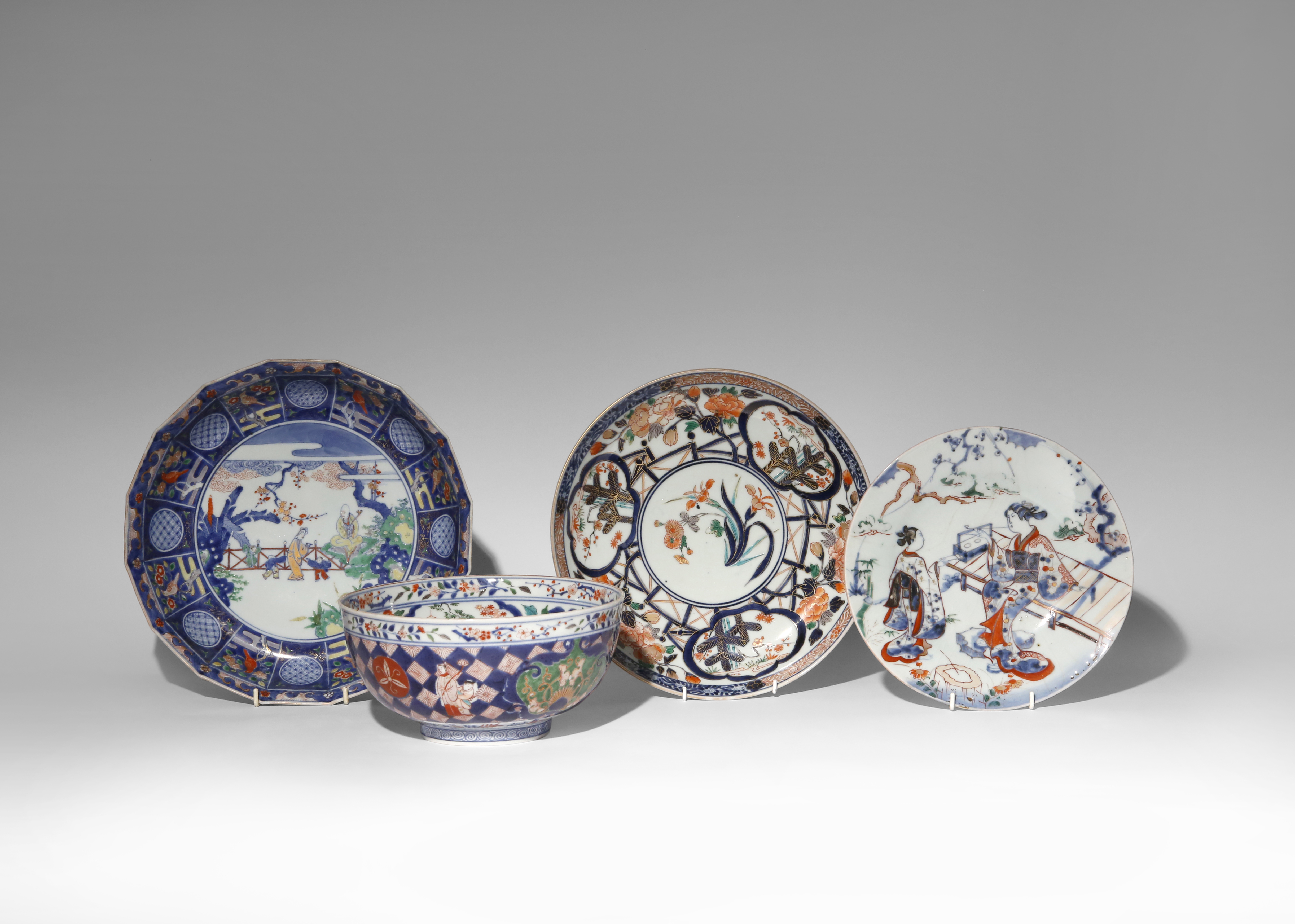 Comprising of three dishes and a large bowl, all typically decorated in underglaze blue, gilt, red, green and yellow enamels, variously painted with figures, flowers and brocade patterns, the largest plate with sixteen sides and with Chinese figures to the well, the characters fu, ki, cho, shun (riches, prosperity and eternal spring) inscribed underneath, 32.2cm max. (5)