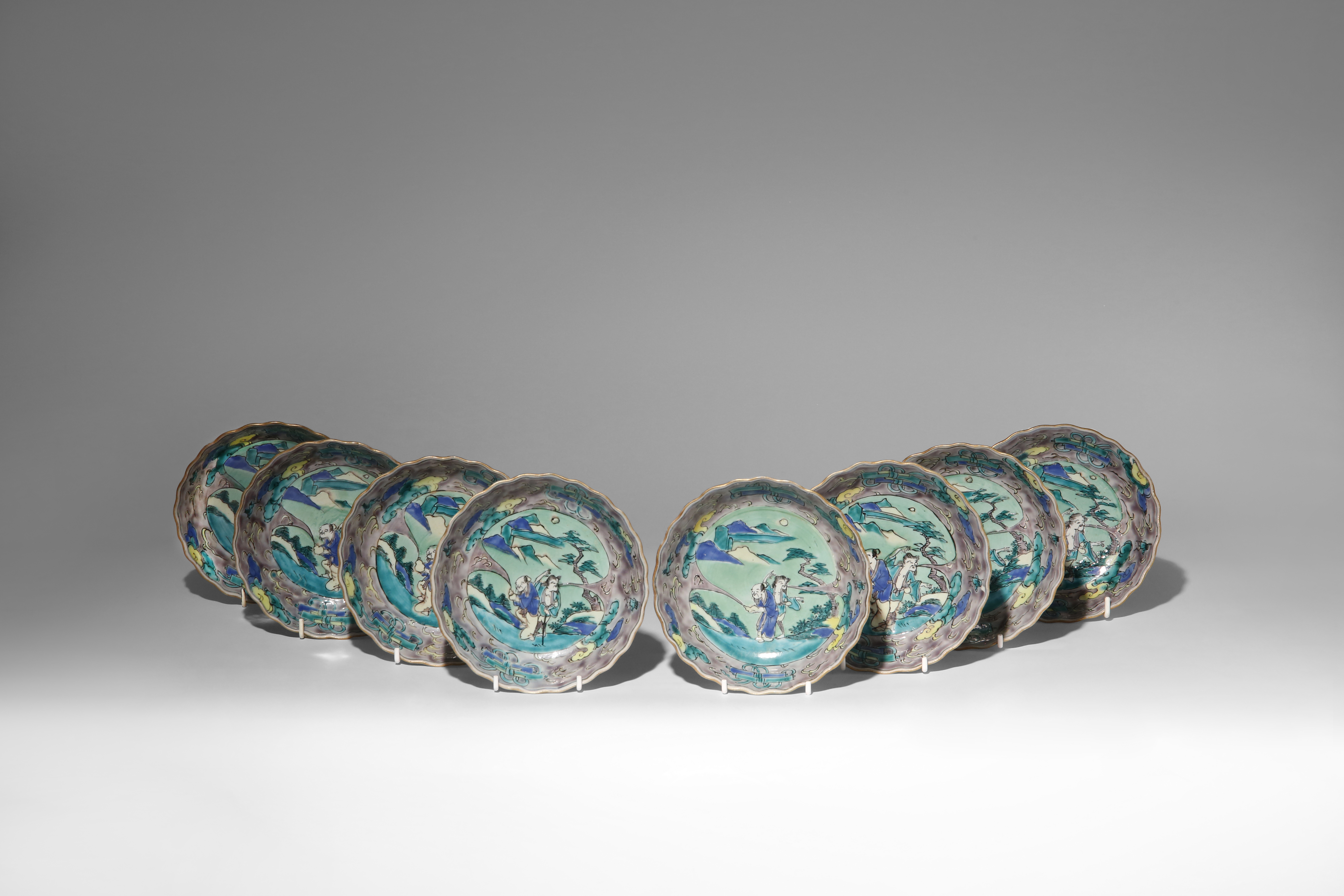 All with a gilt rim and decorated with the same design rendered in underglaze blue and thick coloured enamels, each painted to the well with two Chinese Immortals in a mountainous landscape, one holding a double-gourd whilst the other stands behind him, possibly a reference to a Tang Dynasty story involving two of the Eight Immortals, Zhang Guolao and Li Tieguai, the cavetto and rim with a border of clouds and Buddhist beribboned scrolls, all approx. 15.1cm. (8)
