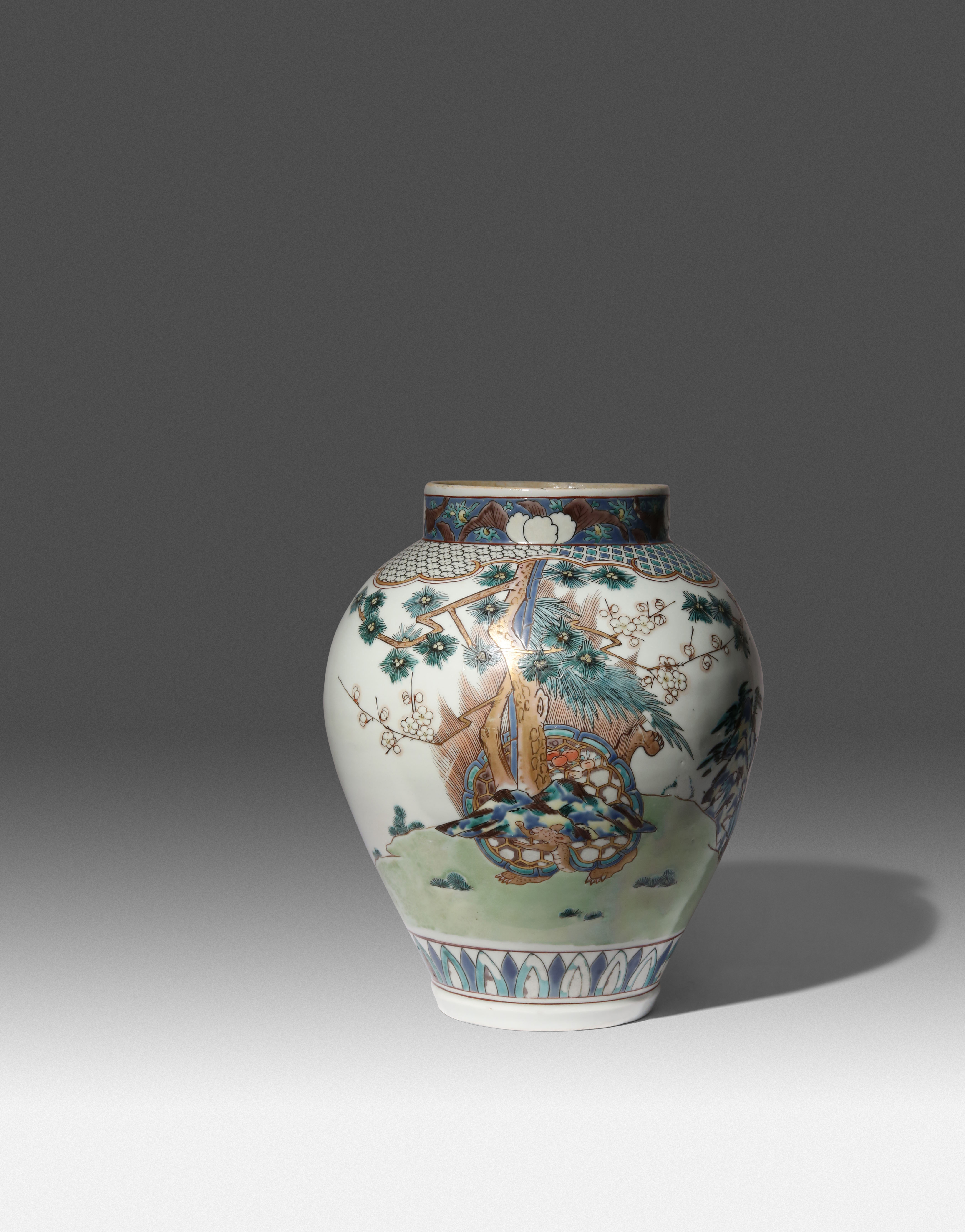 Of baluster shape, decorated in bright coloured enamels and gilt with an Immortal riding a crane to one side, the reverse with a large minogame carrying pine, bamboo and prunus on its carapace; a band of palmettes above the foot, brocade patterns to the shoulder and flowerheads to the neck, 32.3cm.