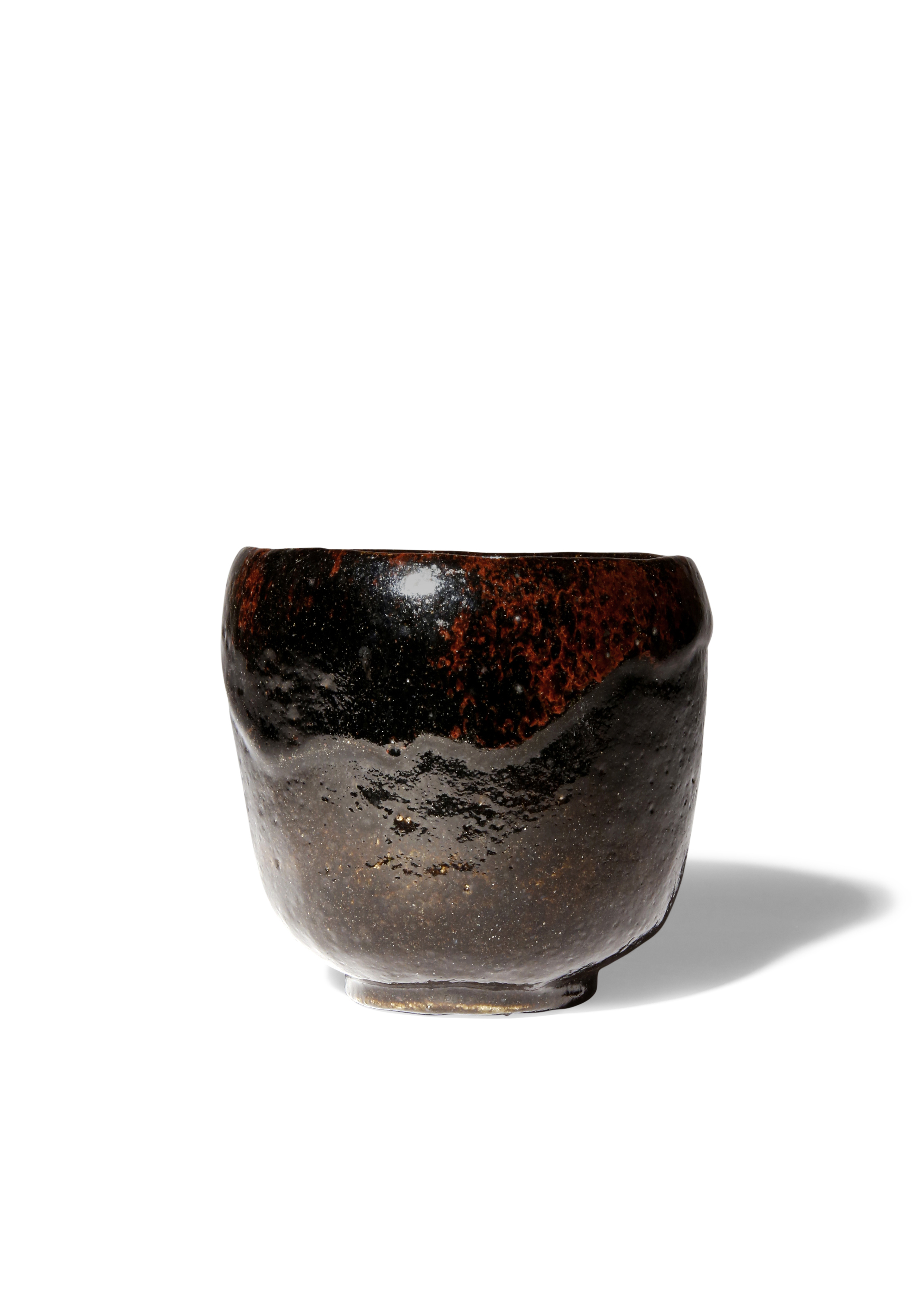 The tall U-shaped body raised on a short foot, the surface with a lustrous black glaze with mottled russet textures, the footrim incised with four lines, together with a tomobako wood box, 10cm. (2)