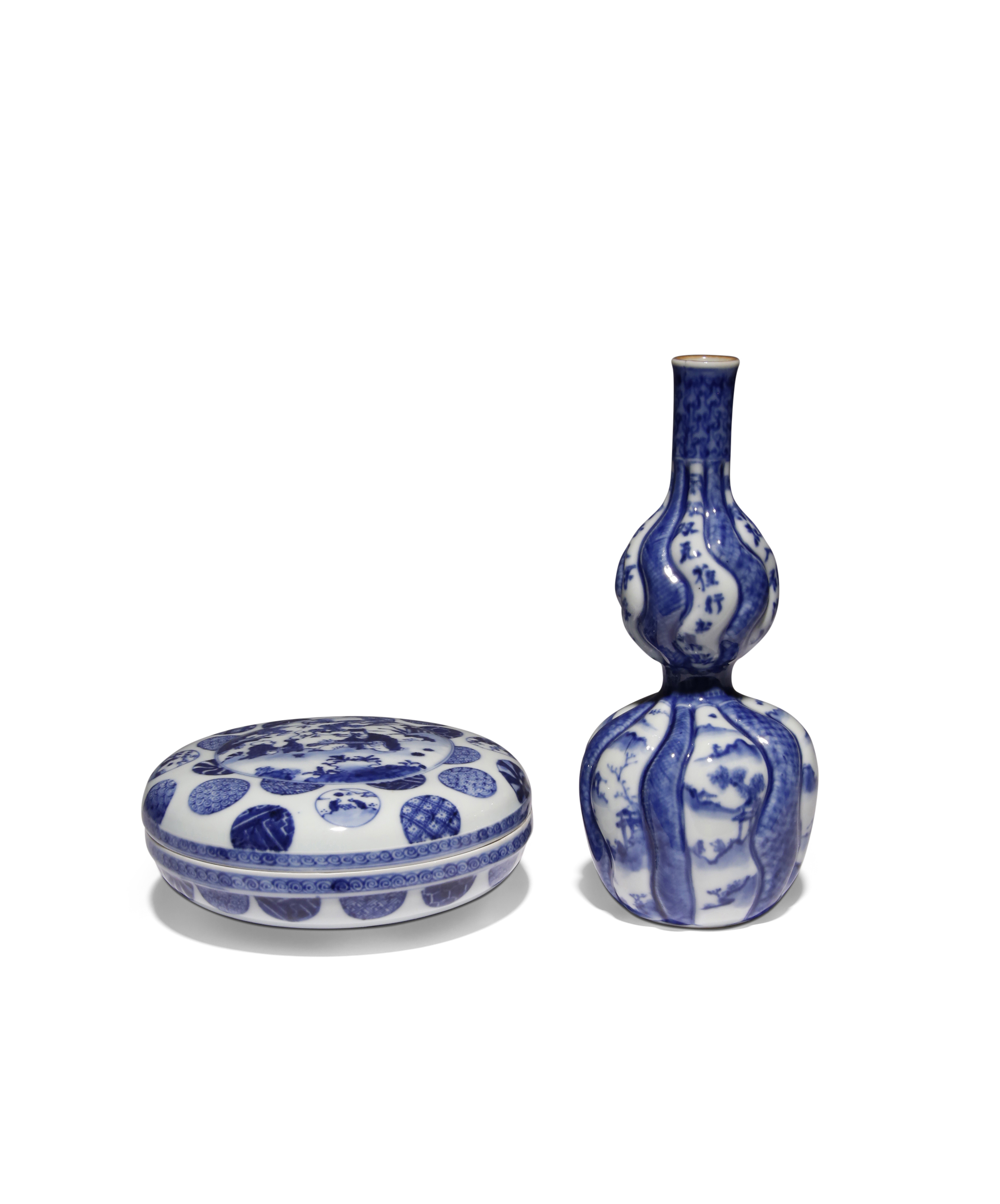 Both pieces decorated in underglaze blue with geometric designs and brocade patterns in shonzui style, the cover of the circular box with a central medallion enclosing a Chinese scholar playing the qin with a boy attendant by his side, a mark underneath reading Xu Ting zao zhi (Made in the Sun Pavilion); the double-gourd vase with shaped panels depicting landscapes on the lower half, the upper section with lines of calligraphy, a circular impressed mark to the side, possibly for Eiraku, 14.5cm and 20cm respectively. (3)