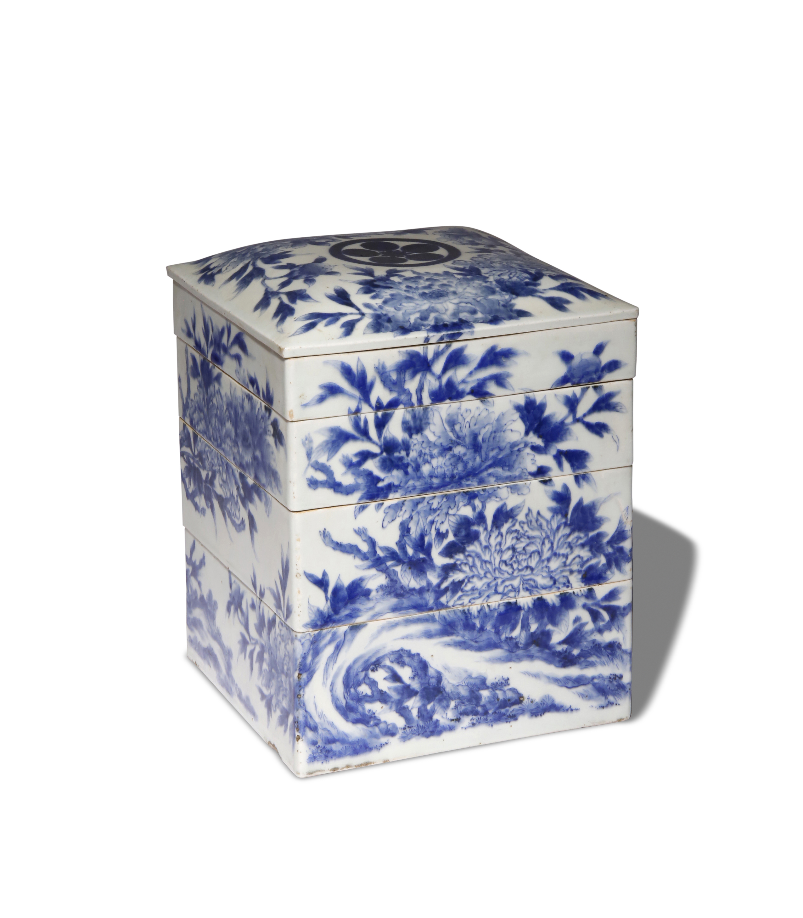 Consisting of four stackable trays of various sizes and a square lid, the sides decorated in underglaze blue with a continuous design of flowering peonies issuing from rocks, the cover painted to the centre with a large Kaga Umebachi mon family crest, 26.2cm overall. (5)