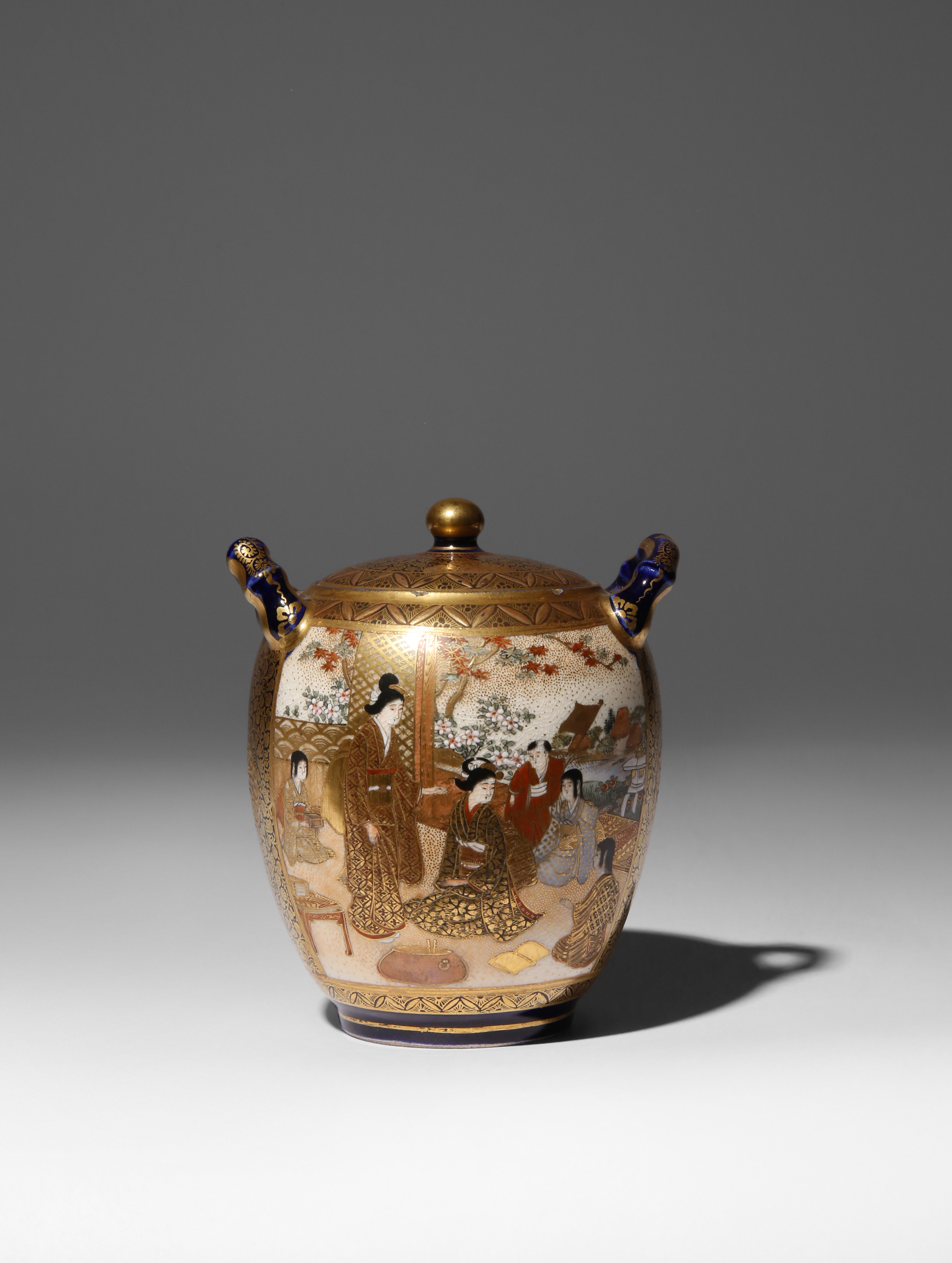 The bulbous body decorated with two large panels enclosing Immortals and attendants to one side and beauties and children to the other, all reserved on a bright navy-blue ground painted with a dense pattern of scrolling tendrils and flowerheads; with bamboo-shaped handles decorated with gilt karakusa scrolls and hanabishi mon, the lid with similar decoration, inscribed to the base and with an impressed seal mark, both reading Kinkozan zo, 12.3cm. (2)