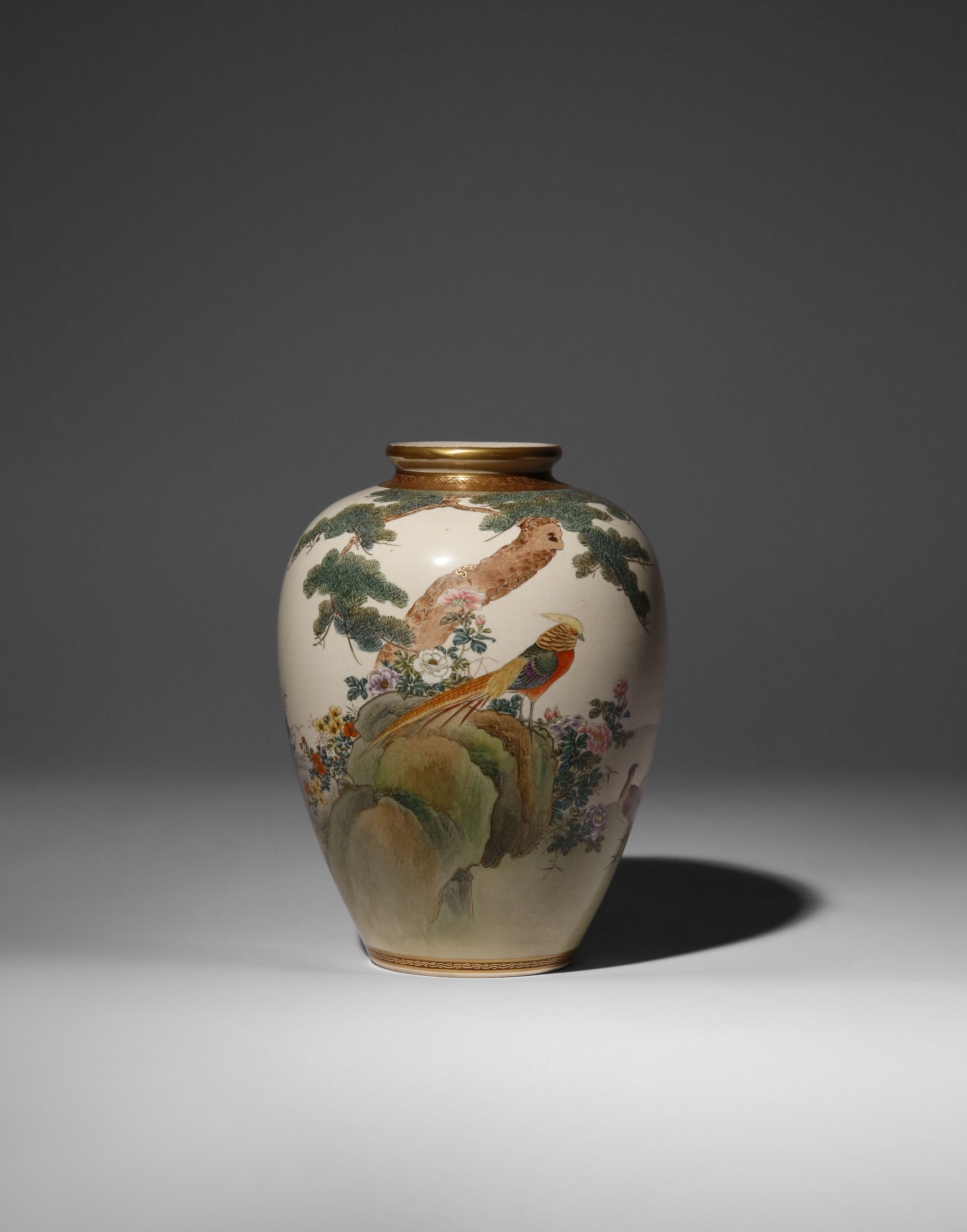 The bulbous body with a short everted rim, decorated with a continuous scene of brightly-coloured pheasants in a garden with rocky outcrops, a large pine above them and many daisies, peonies and other flowers to the side, a border of cash design under the neck and scrolls above the foot, the base marked Kinkozan zo, 20.7cm.