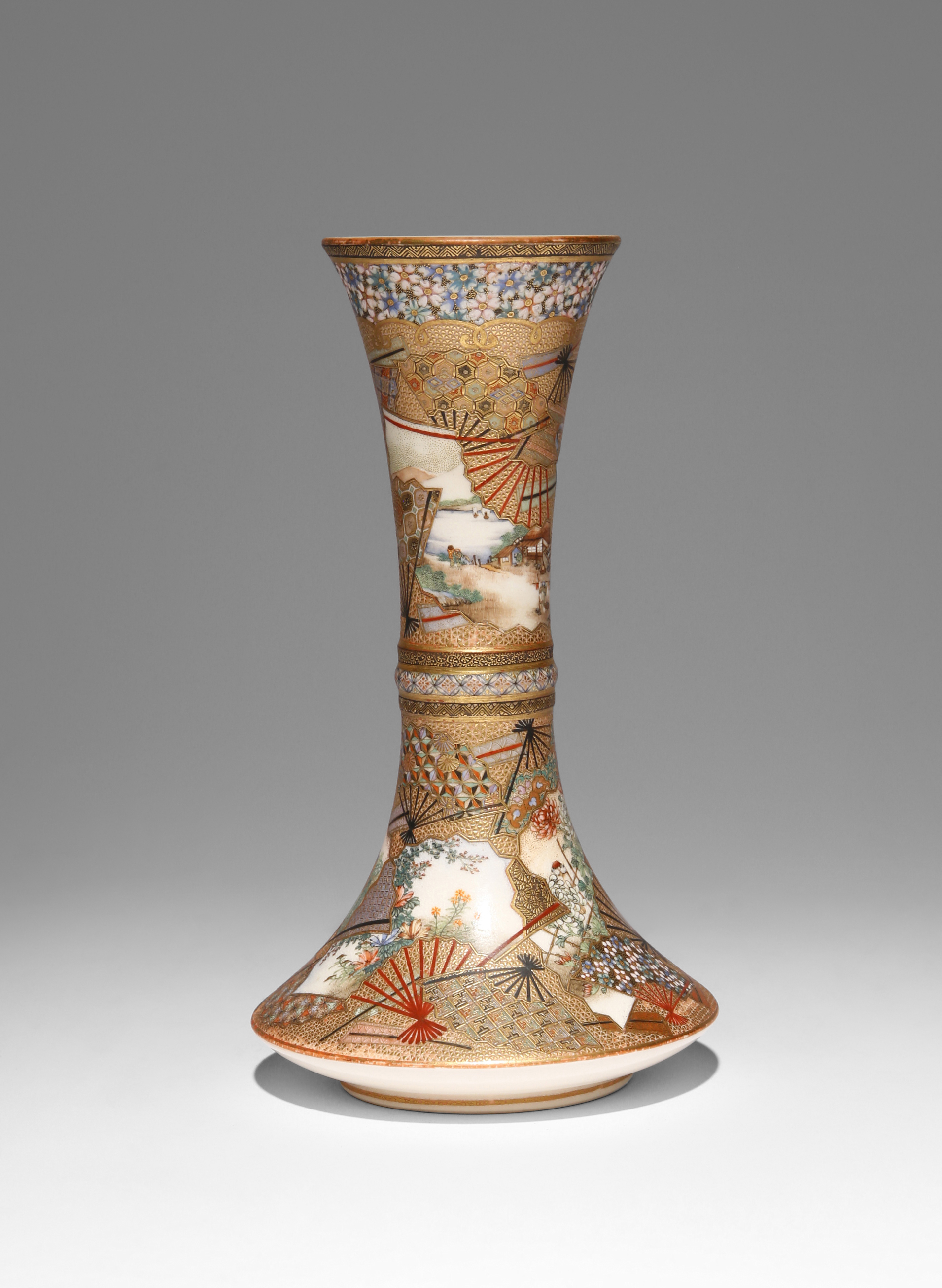The trumpet-shaped body richly decorated with a multitude of fans on a dense ground of small gilt triangles, each fan painted with a different design including flowers, landscapes, butterflies, figures, and brocade patterns, a band of flowerheads underneath the rim, the base with an impressed mark reading Kinkozan zo, 20cm.