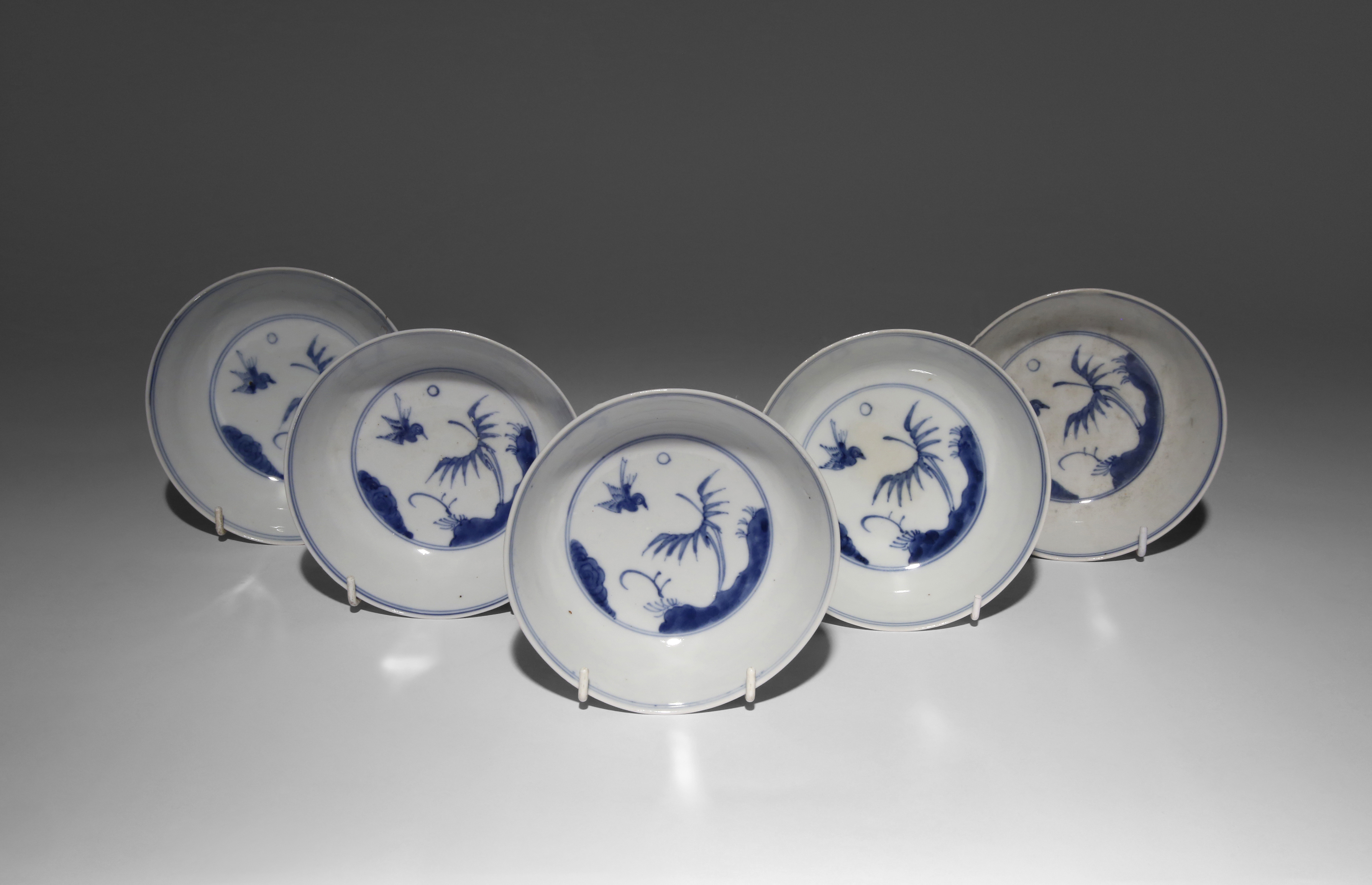 Possibly ko-sometsuke pieces made for the Japanese market, each painted to the well with a small bird in flight above stylised bamboo, with the moon and scrolling clouds to the sides; each painted to the reverse with the Three Friends of Winter, prunus, bamboo and pine; all with a mark reading Da Ming Chenghua nian zhi to the reverse, all approx. 13.9cm. (5)
