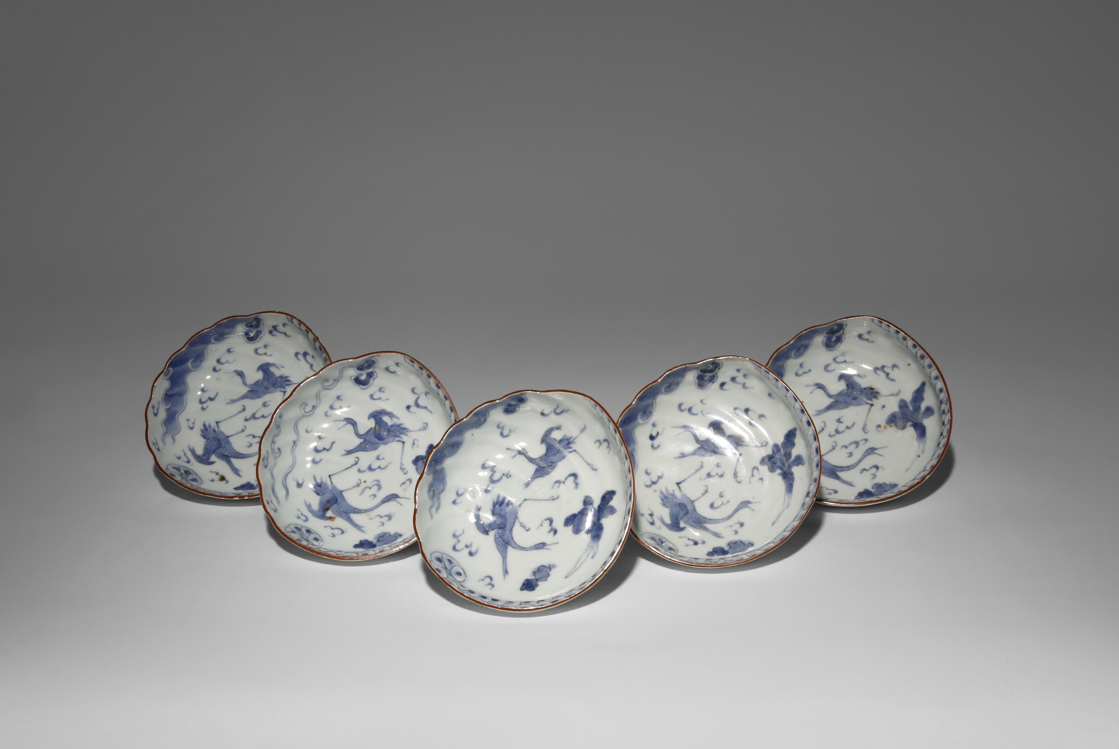 A SET OF FIVE JAPANESE MOULDED BLUE AND WHITE DISHES
