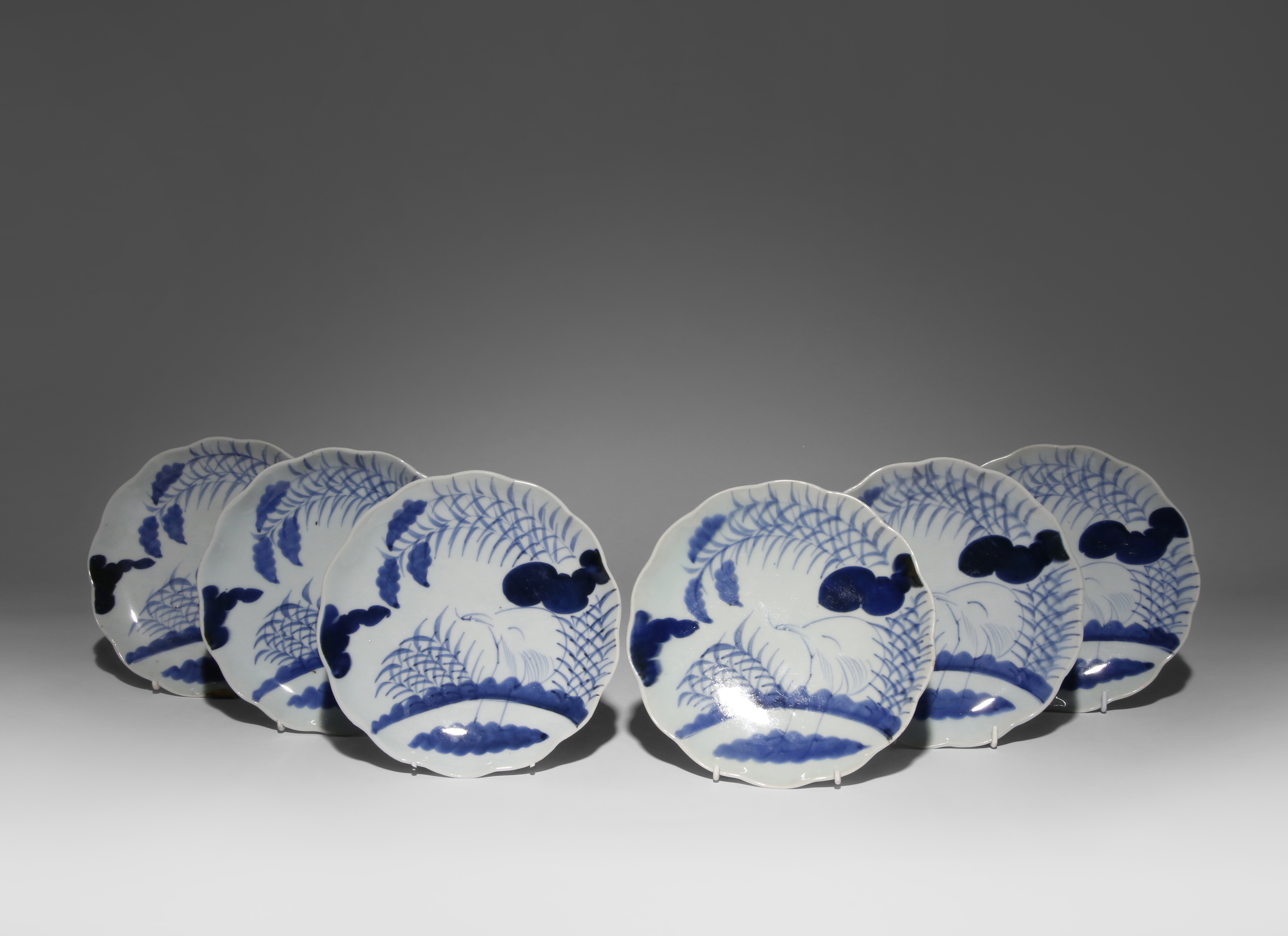 A SET OF SIX JAPANESE BLUE AND WHITE DISHES