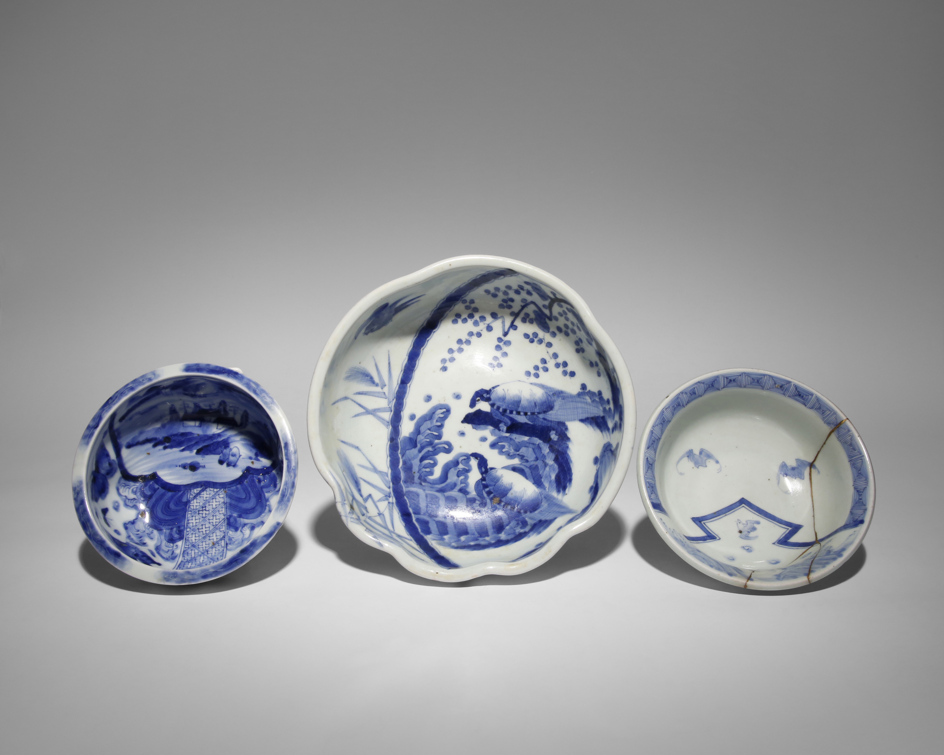 All with underglaze blue decoration, the largest with a foliate rim and painted to the well with two minogame to one side and a bird in flight to the other, the reverse with further birds and waves; another bowl with kintsugi gold lacquer repair and painted with bats, waves and chidori; the third with a mountainous river landscape, butterflies, birds and brocade patterns, 27.5cm max. (3)