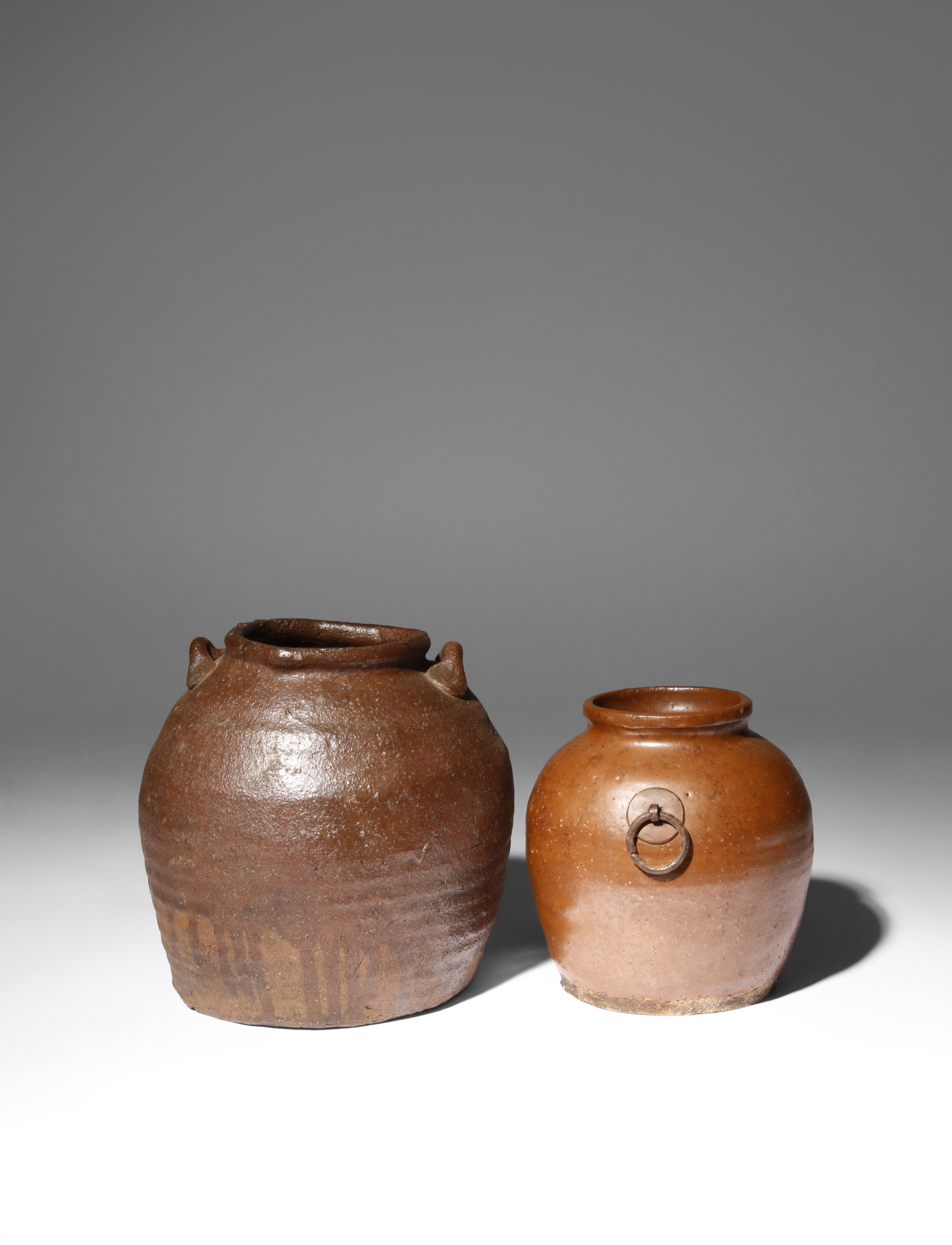 Both with a brown body, the largest with two small handles applied to the shoulder, the other vessel with a metal ring for suspension to the back, 15cm and 12cm respectively. (2)