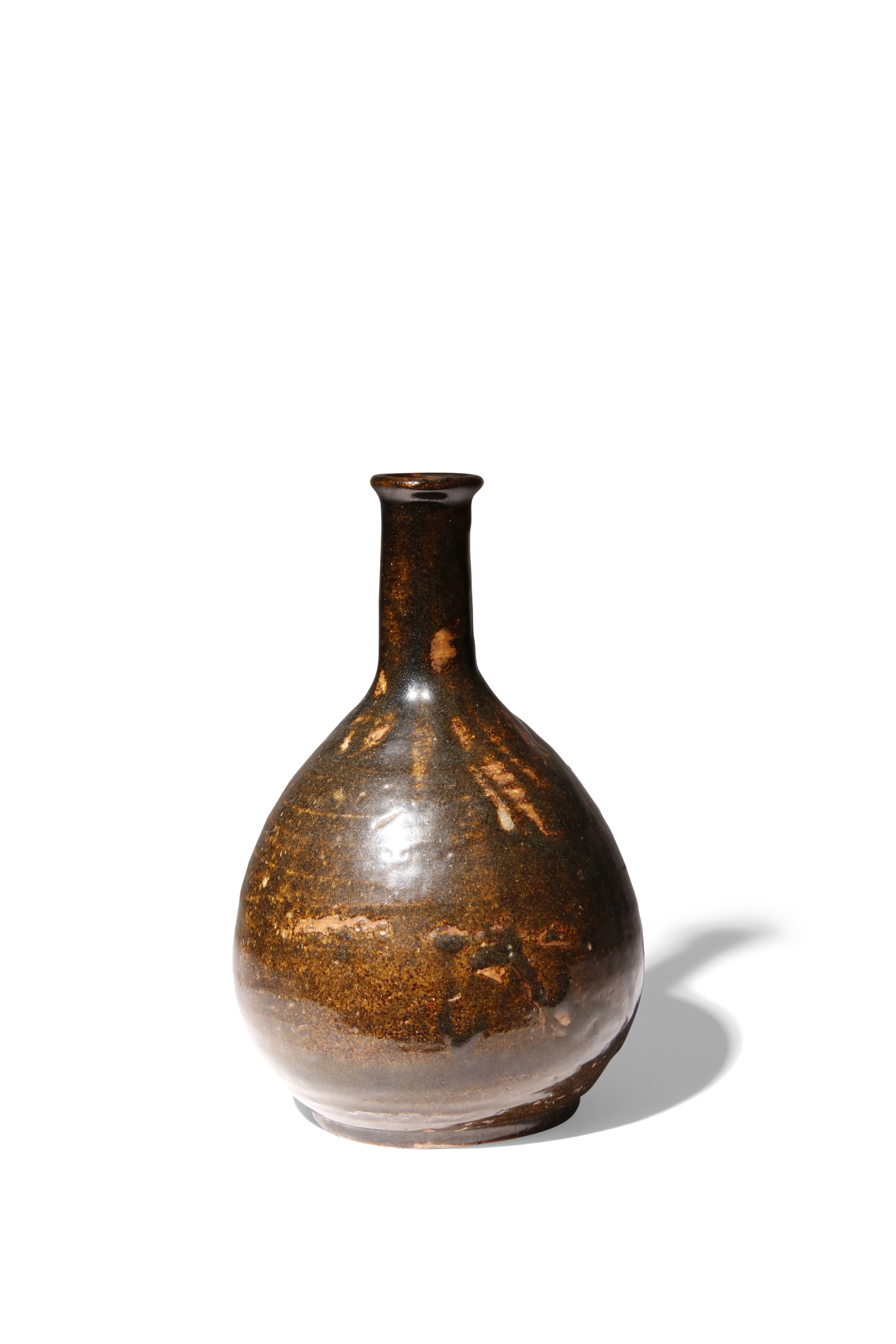 The bulbous body with a tall neck and a slightly everted rim, the sides with a mottled chocolate-brown glaze, 24.5cm.