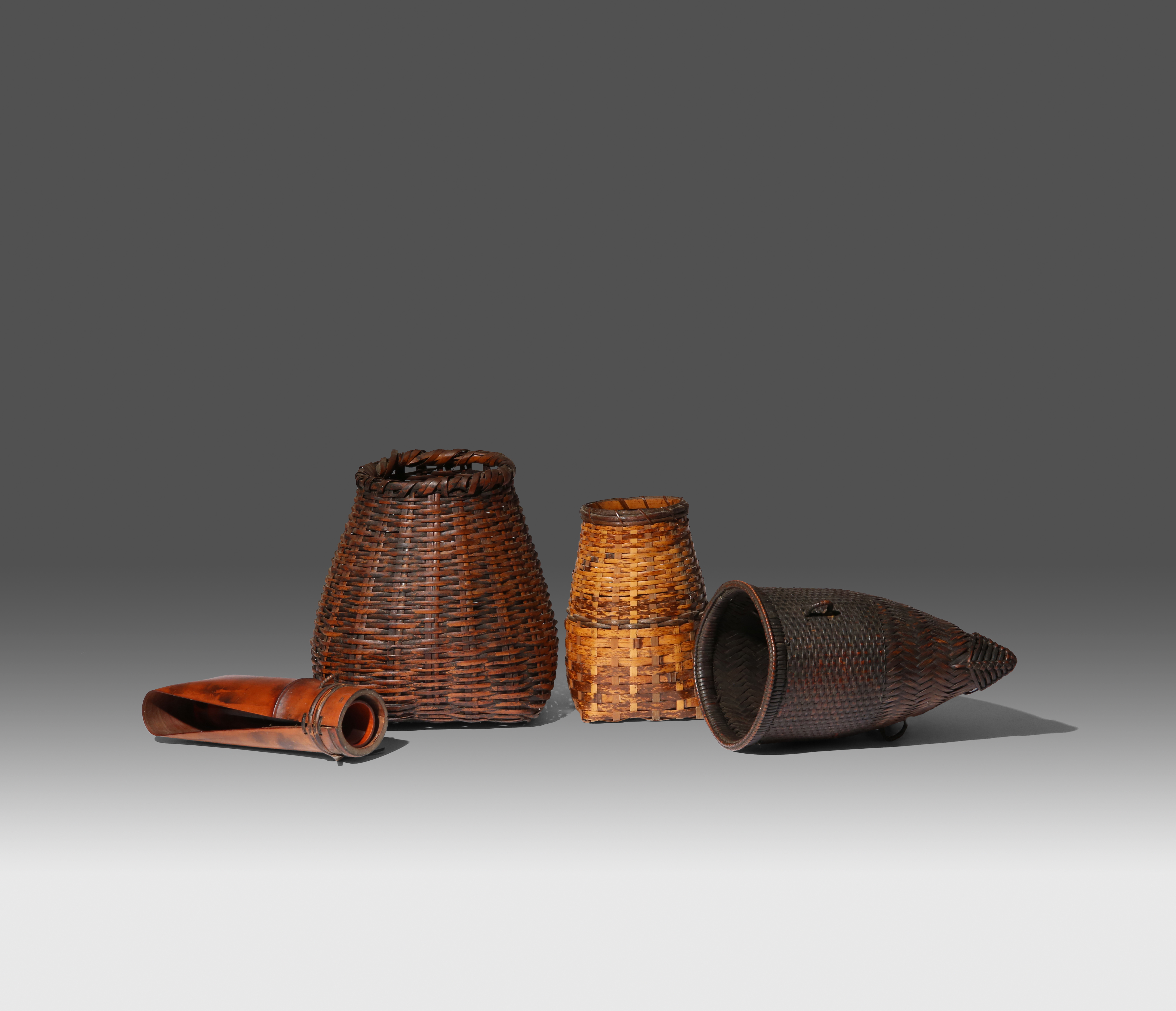 Of various shapes, three made from numerous bamboo strips woven into intricate patterns, the fourth made of a single strip bent in half, a cylindrical lacquer container inside; each piece with a loop to the side to be used as a wall vase, 21.5cm max. (5)