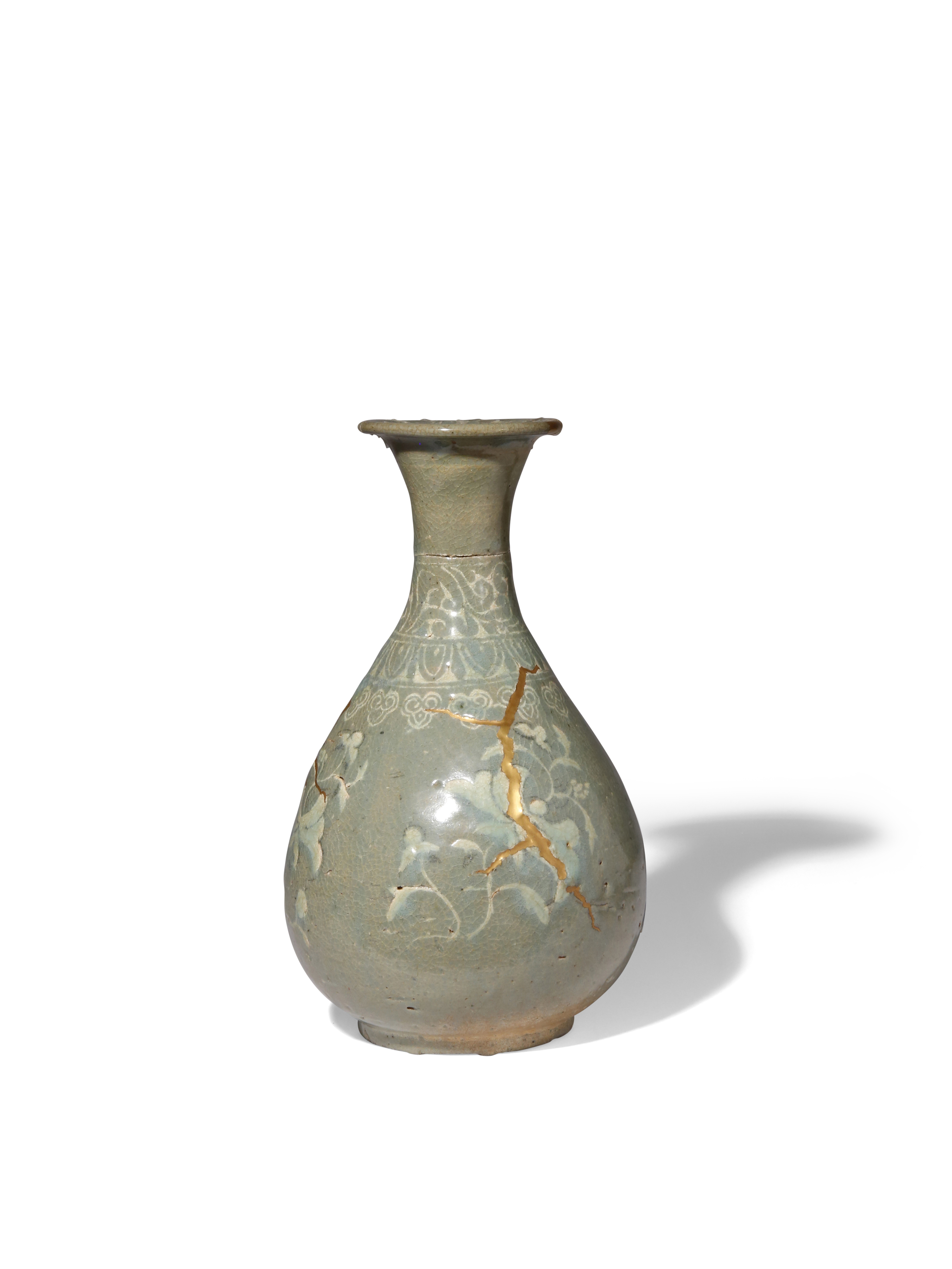 The elegant pear-shaped body decorated with four sprays of lotus, the neck with bands of ruyi heads, lappets, and scrolling tendrils, with kintsugi gold lacquer repairs, 27.8cm.