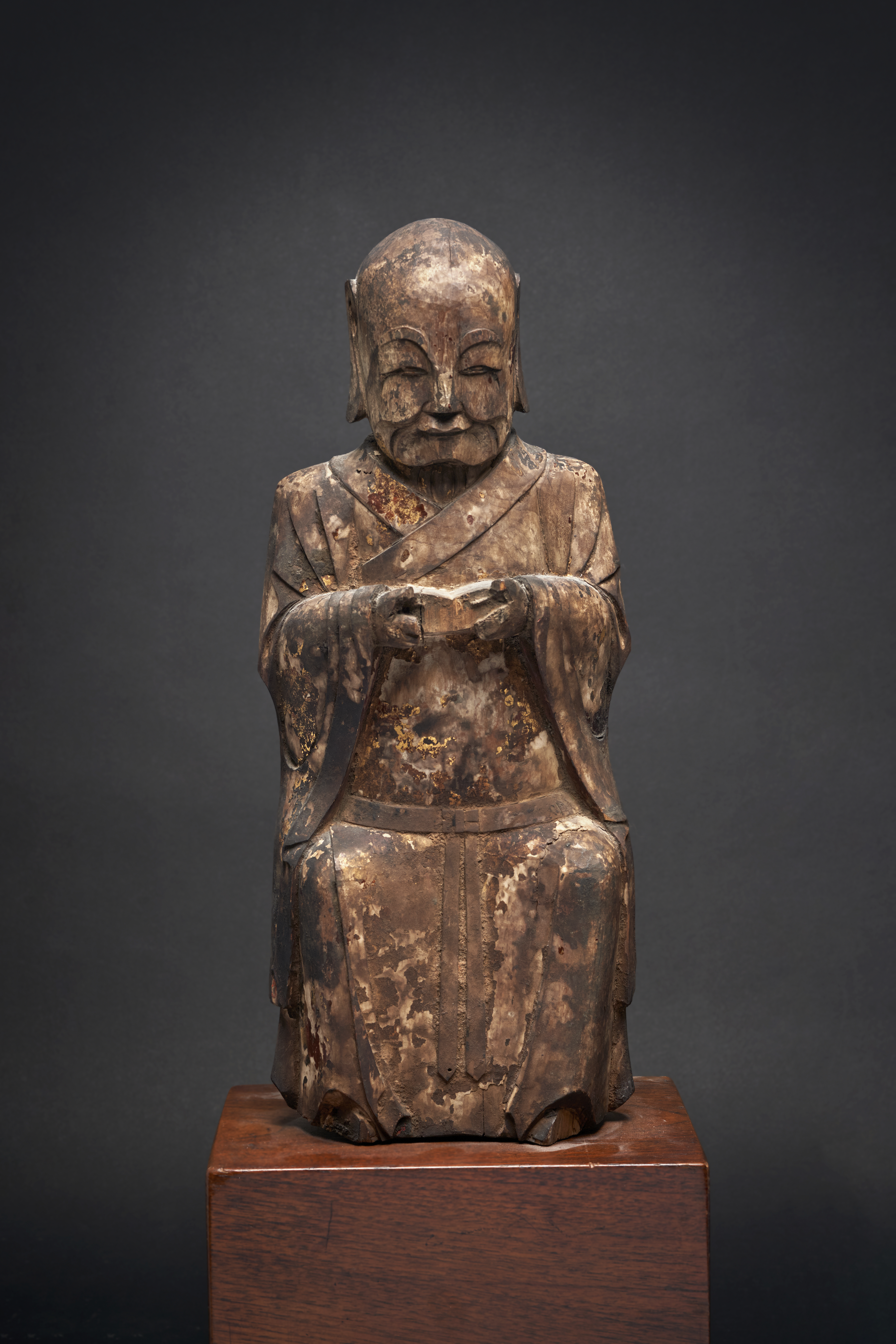 Possibly Korean, carved seated with his hand held before his chest, dressed in long flowing robes, with a tranquil expression upon his face, with a fitted wooden base, 47cm. (2)