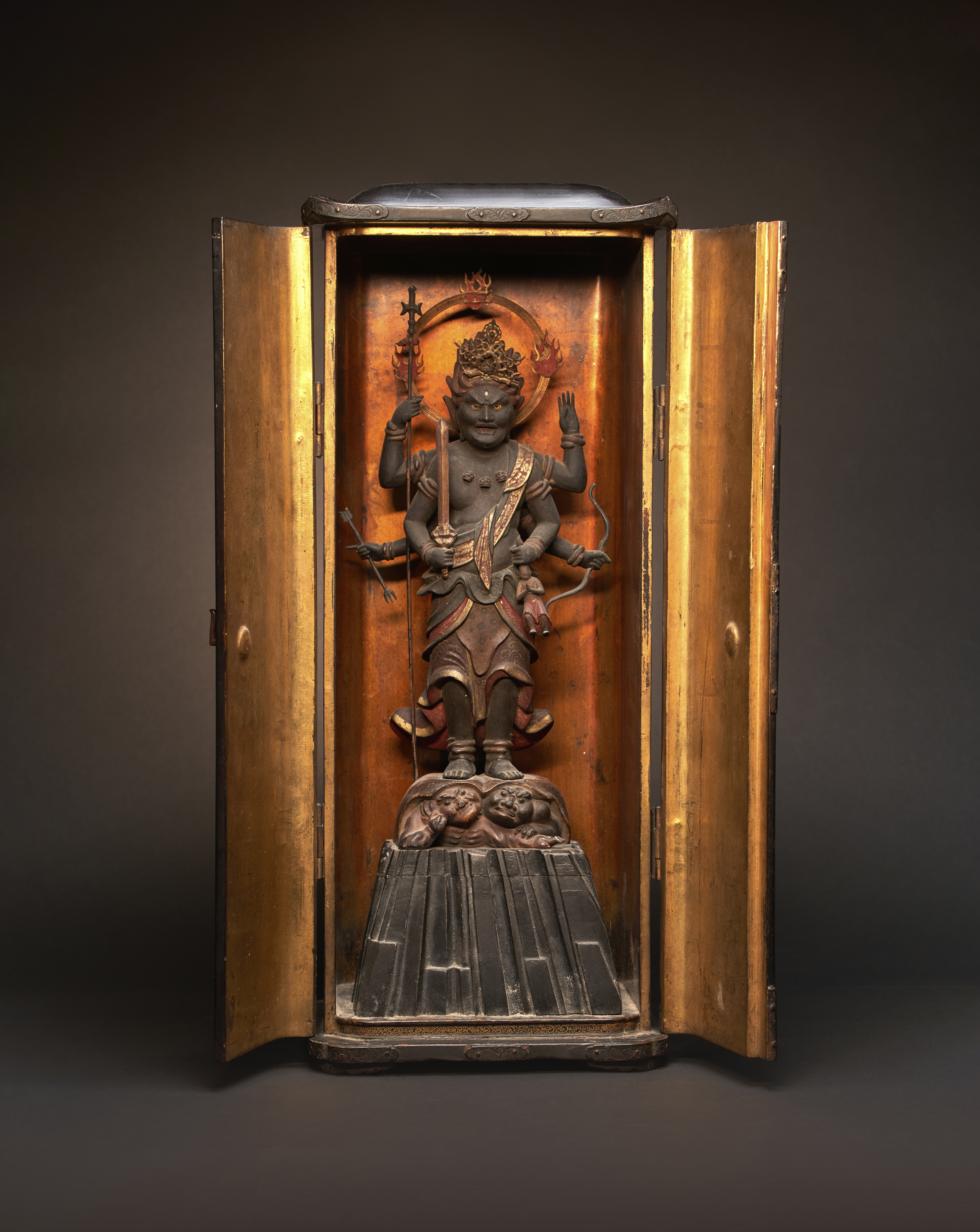 The case lacquered black, the doors opening to reveal the tall figure of a Buddhist guardian deity, probably Kōshin-shinkō; the wrathful figure standing on two oni, the demons crouching underneath a tiger skin, all raised on a rocky outcrop; the God depicted with six arms and three eyes, holding various attributes including a bow and arrow, a sword and a halberd; another hand grasping the hair of a small human figure in prayer, probably the soul of a worshipper; wearing lose robes revealing his bare torso and a necklace made of three skulls; his crown and mandorla behind him made of soft metal; with details rendered in polychrome and gilt,