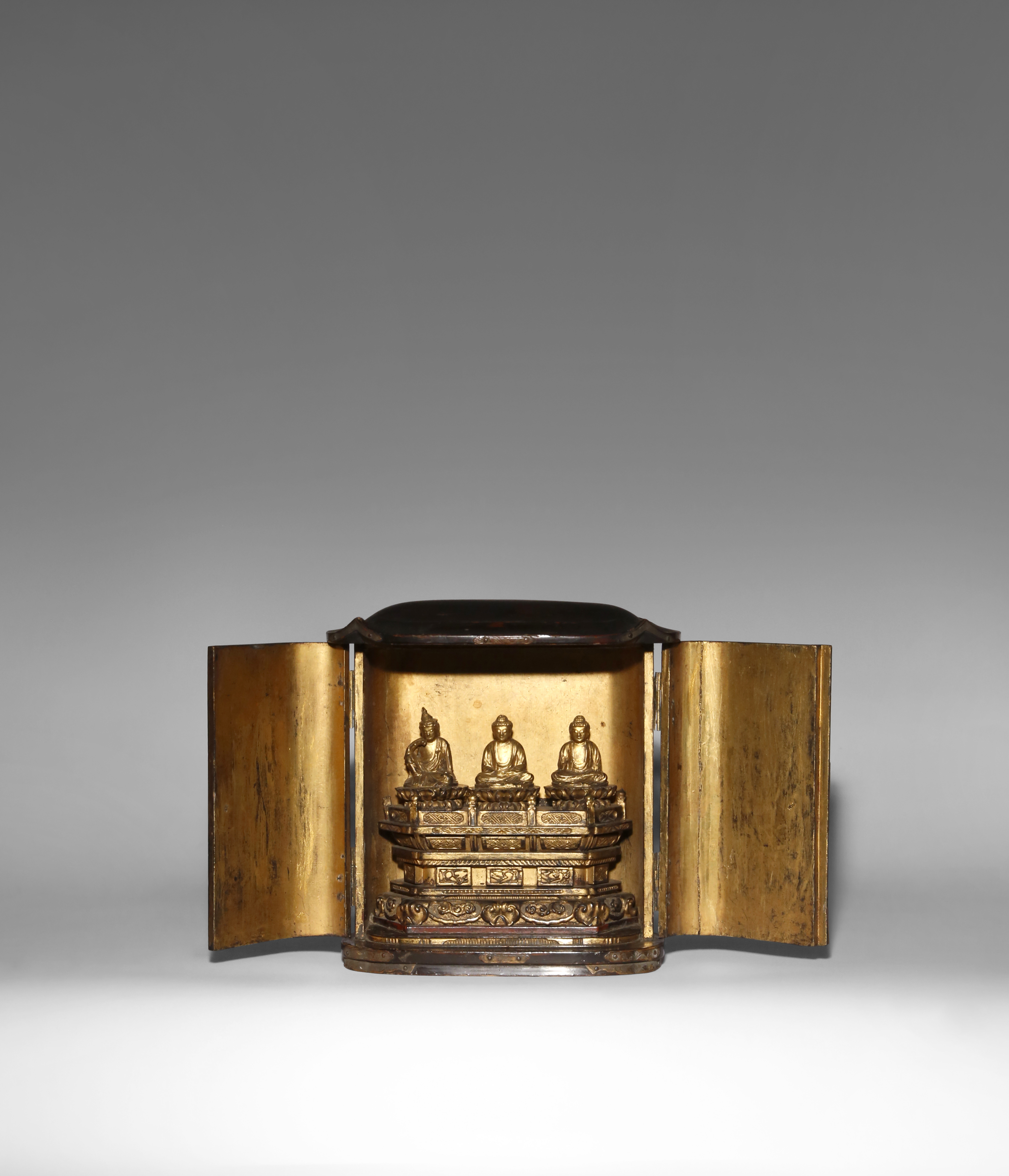 The case lacquered black, the doors opening to reveal the Amida Triad comprising of Amida Buddha, Kannon Bosatsu and possibly Seishi Bosatsu, the figures seated on double lotus thrones raised on a tall base decorated with scrolling clouds, reishi heads, flowers and geometric patterns, the whole interior gilded, with two illegible lines of inscriptions to the base, 24.3cm x 11cm x 23.5cm.