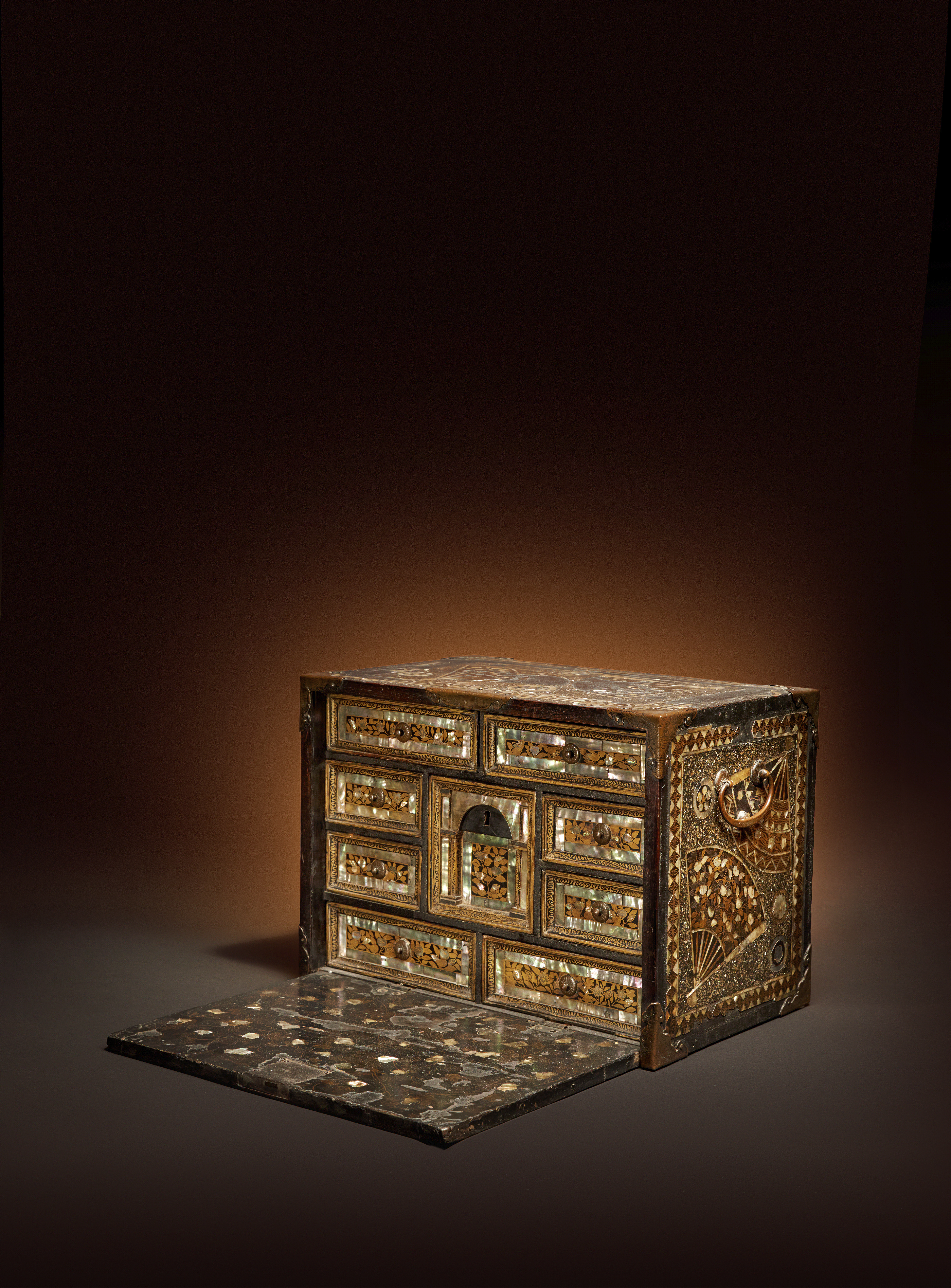 Of rectangular form and with a hinged fall front opening to reveal nine drawers, the door and sides decorated with panels enclosing many fans embellished with bands of geometric designs and flowering branches of prunus, scrolling tendrils, and ume-bachi mon (family crests), in between borders of chevrons and other formal patterns, the decoration rendered in a multitude of raiden (mother of pearl) inlays and gold and black lacquer, the inside with further mother of pearl inlays and gilt decoration depicting panels of flowering prunus and peony, the copper fittings and side loop handles with designs of melons, flowers and tendrils, together with a key, 28cm x 37.5cm x 24cm. (2)