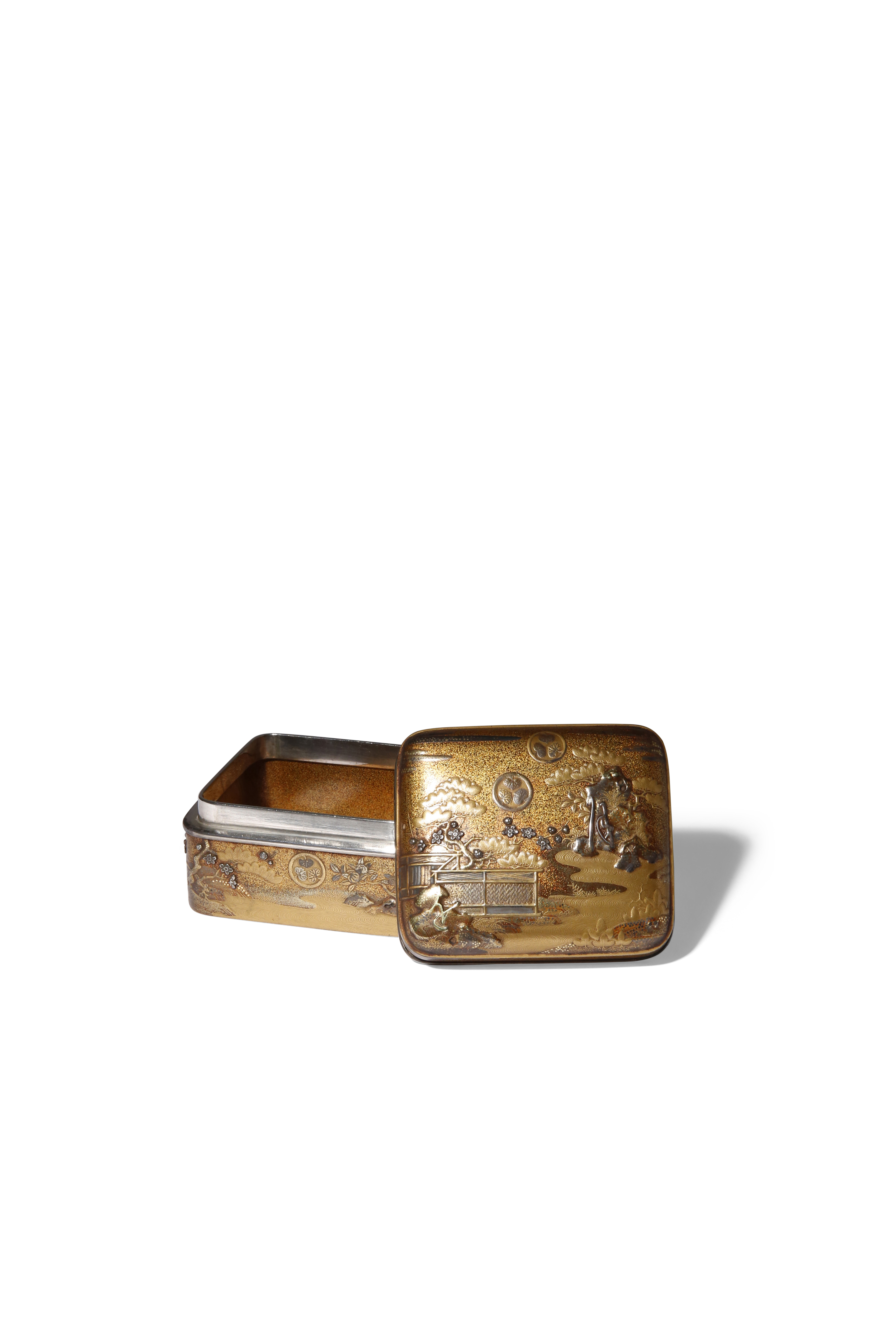 Of rounded rectangular form, decorated in gold and silver takamaki-e, hiramaki-e, and with silver inlays on the nashiji ground, the cover and sides embellished with a stream meandering amongst rocks, flowering prunus and pine to the side, some branches issuing from behind fences made of woven bamboo; with two raised characters reading tsuki o (the moon), possibly a reference to a chapter from the Tale of Genji, and with ai go mon crests for the Tokugawa clan repeated across the composition, 6.7cm x 7.5cm x 8.7cm. (2)