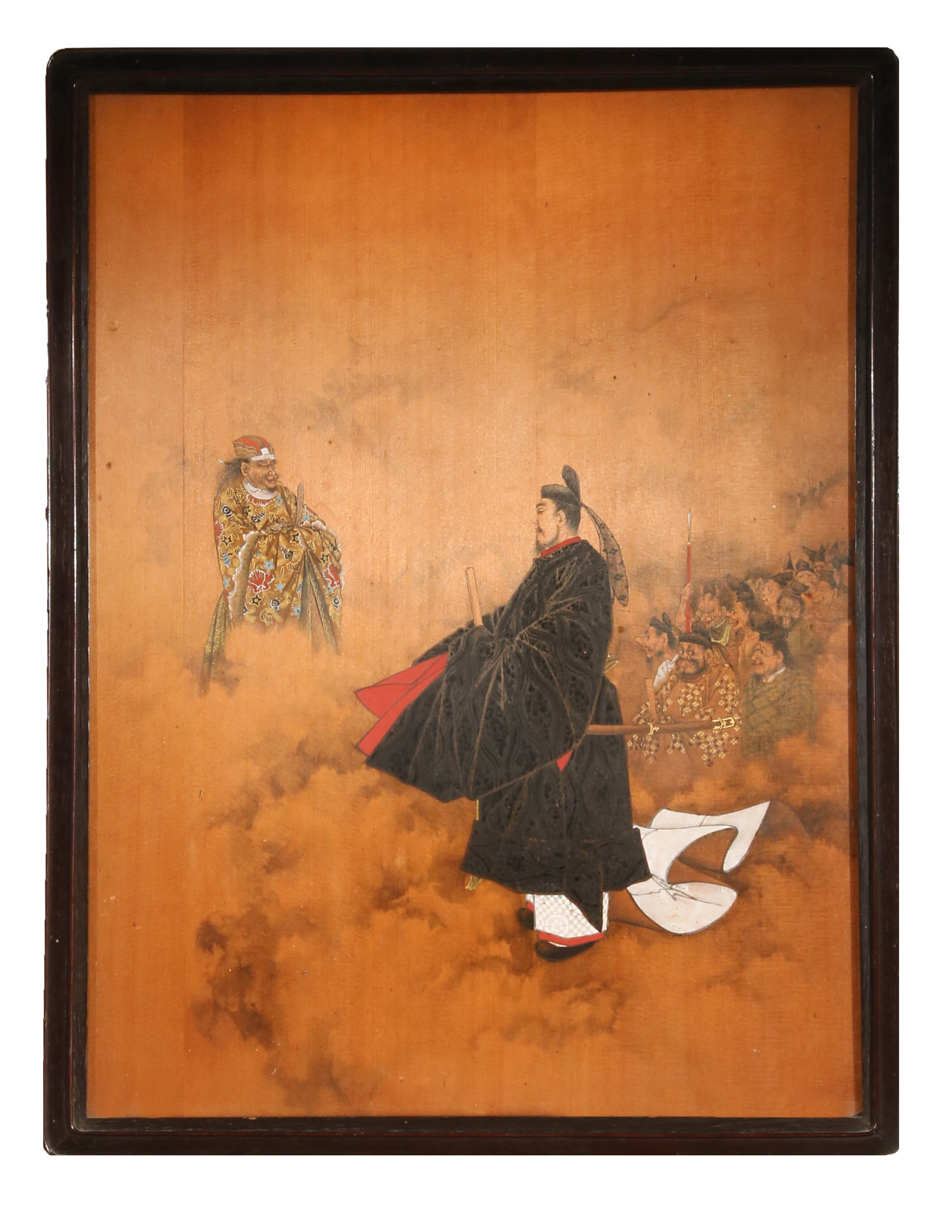 Of rectangular form and painted in ink and pigments, the heavy wood panel decorated with Ono no Takamura, Emma-O, and a queue of demonic figures behind them, the tall scholar dressed in long black garments, holding a shaku tablet before him and looking up towards the King of Hell, the Lord of the Underworld depicted with ornate robes embellished with patterns of seashells; framed and glazed, a paper label on the back explaining Ono no Takamura's story, 60.3cm x 46.5cm.