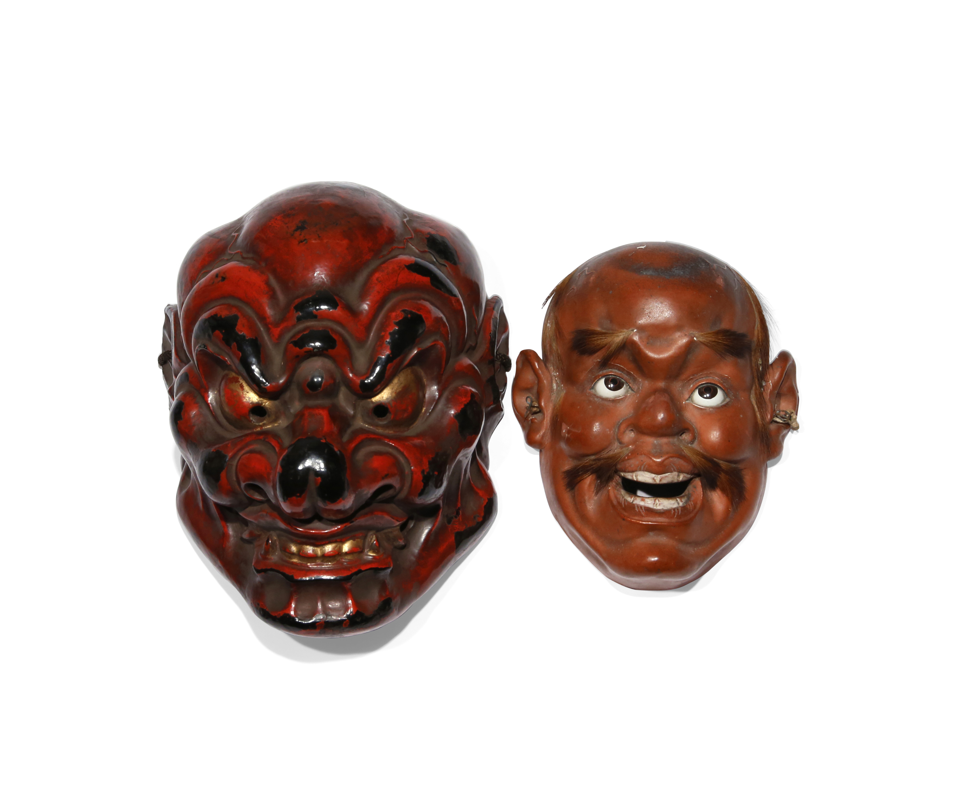 The largest a lacquered wood Noh mask of a Nio, the Buddhist guardian king depicted with a ferocious expression and an upturned nose, the surface in a lustrous red and black lacquer and with details of the eyes and teeth in gilt, a two-character signature to the reverse; the other an iki-ningyo mask depicting a man with bushy hair, eyebrows and moustache; in wood covered with gesso and pigments, and with glass eyes, 26.7cm and 19.5cm respectively. (2)