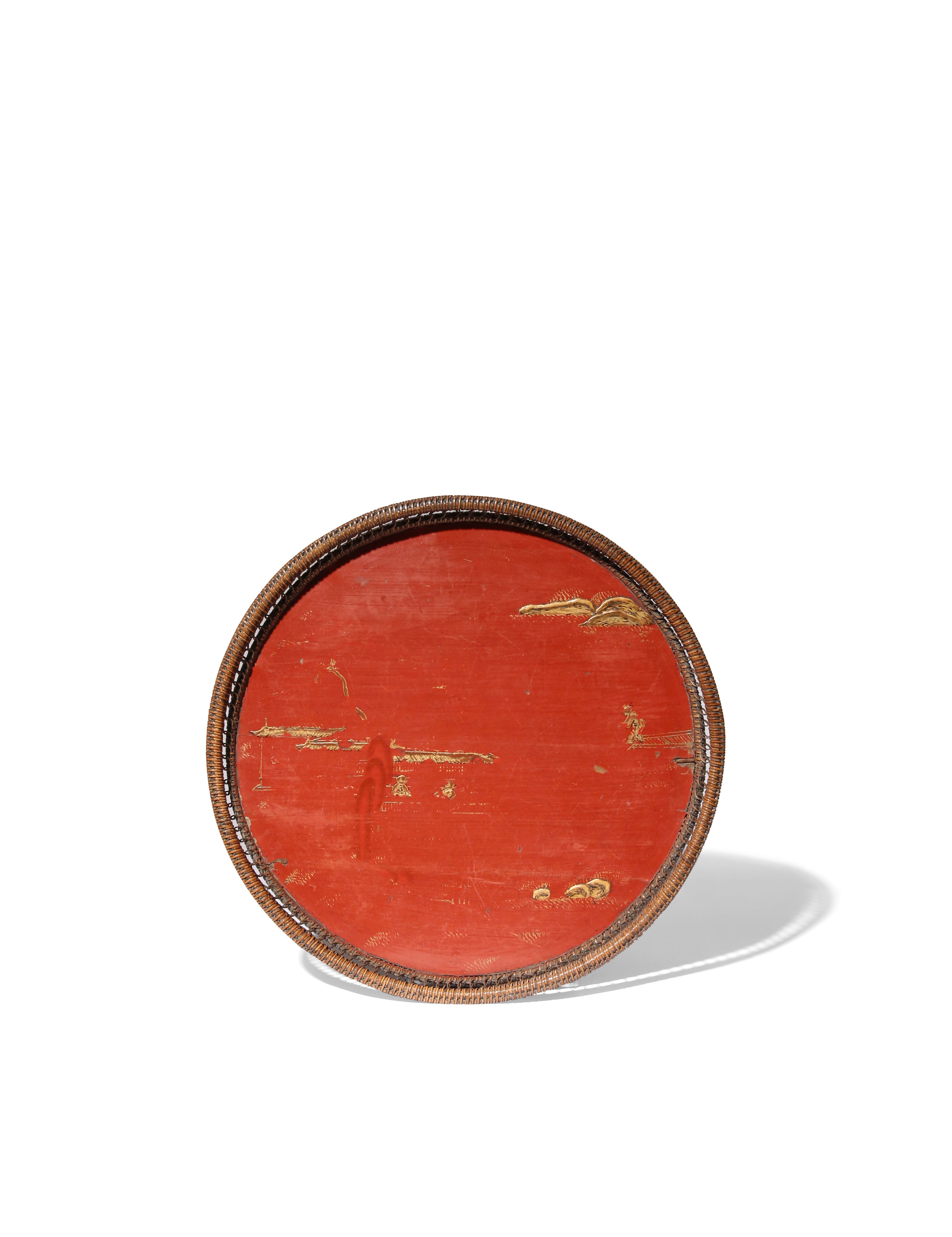 Of circular shape, with remnants of gilt and litharge decoration to the well depicting Chinese figures in a landscape, the rim embellished with bamboo strips woven in loops, together with a fitted silk box, 33cm. (2)