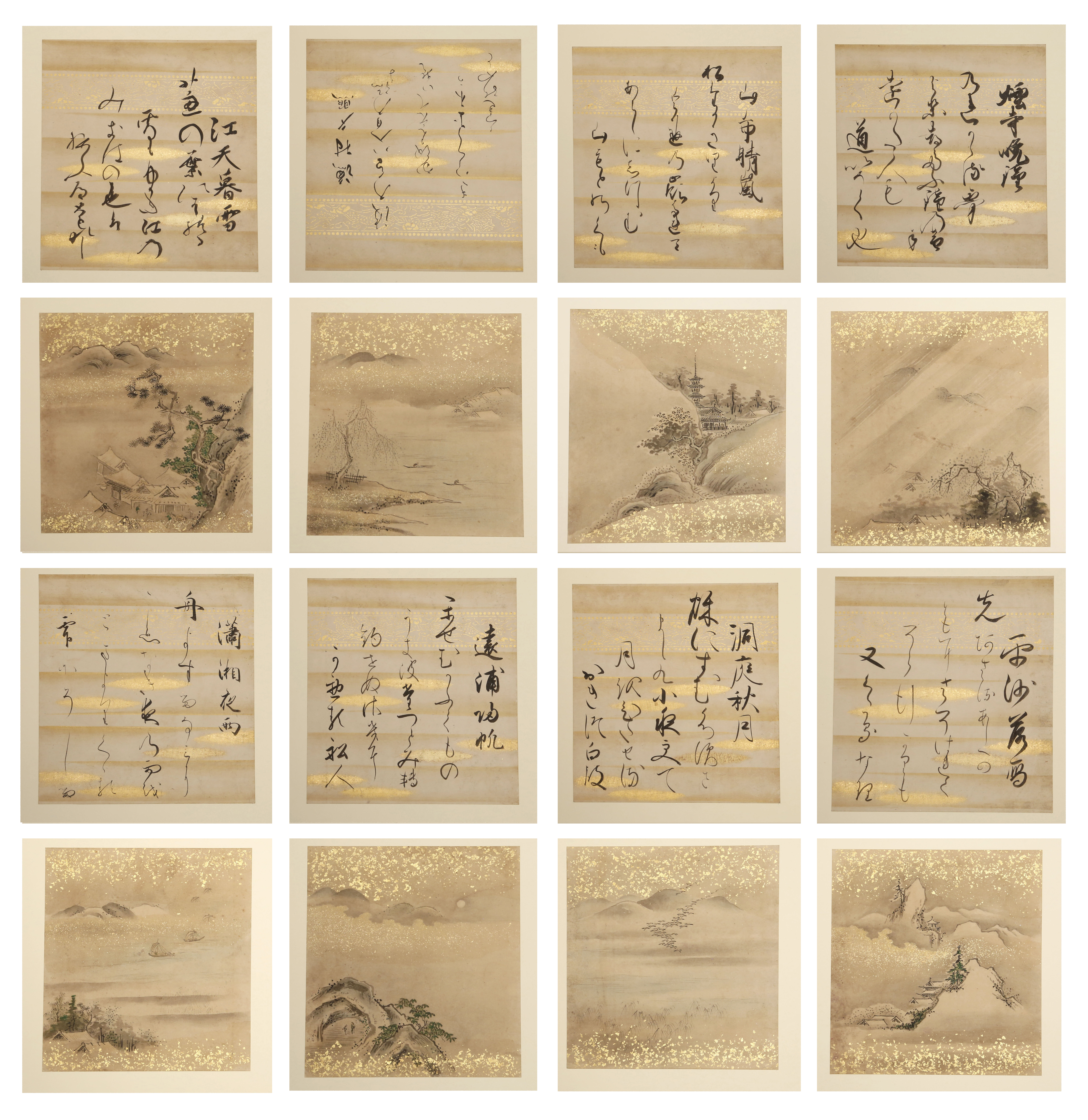 A set of sixteen Japanese paintings, ink and colour on paper with gold flakes, including eight leaves of calligraphy in chirashi-gaki (scattered writing) style with borders of stylised dragons, and eight paintings comprising: a view of pavilions in mountainous river landscapes; another painting depicting a flock of geese in flight above marshes; a third with two travellers on a rocky outcrop, with the moon above; sailing boats on a lake; a village in a rain storm; a multi-storey pagoda nestled amongst trees; fishermen with nets, and many figures in a village, each mounted on board separately, together with two silk covers, each picture approx. 20.4cm x 18.5cm. (18)