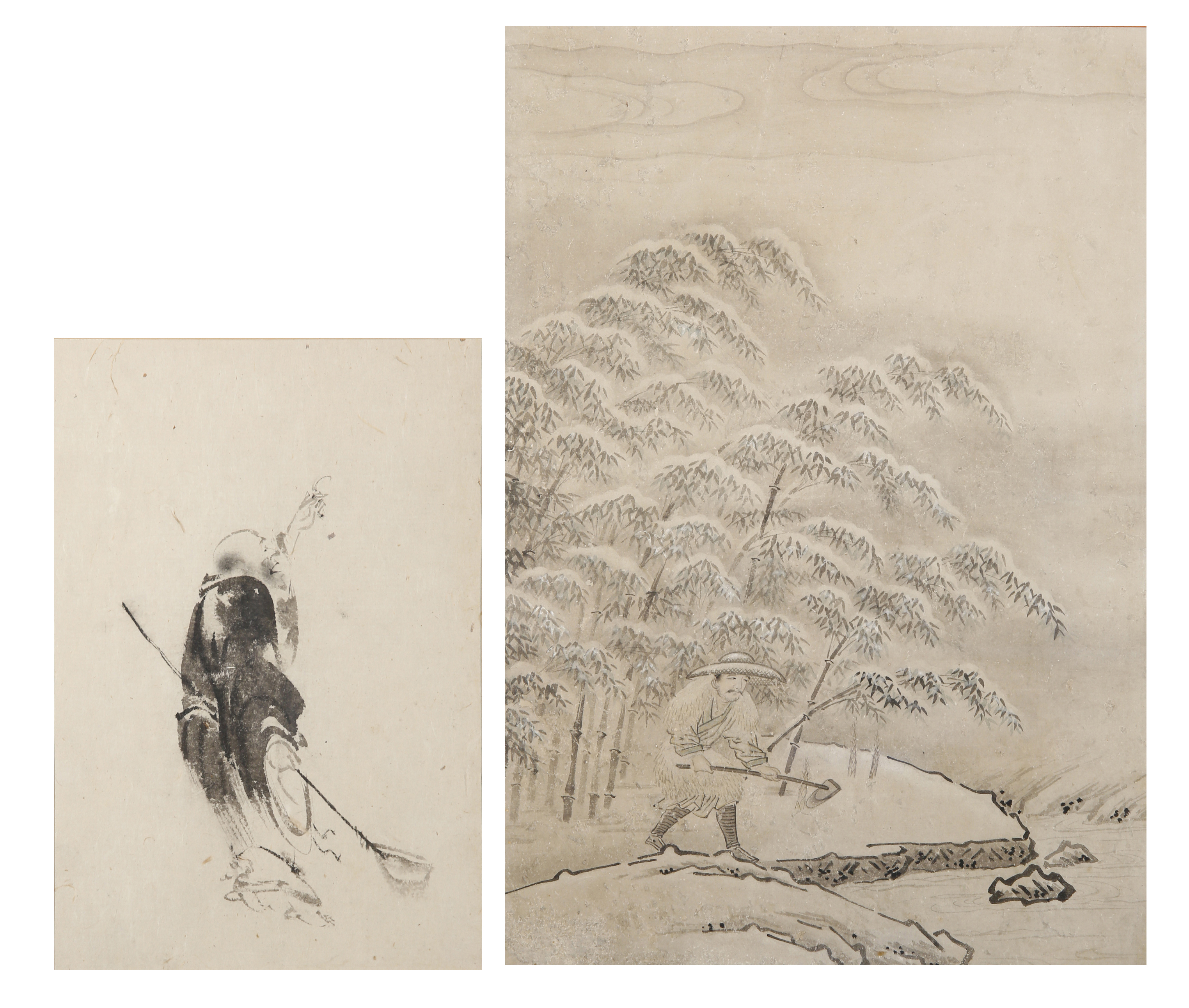 The larger painting may be a depiction of Moso, one of the Twenty-Four Paragons of Filial Piety often represented digging for bamboo shoots to feed his sick mother.