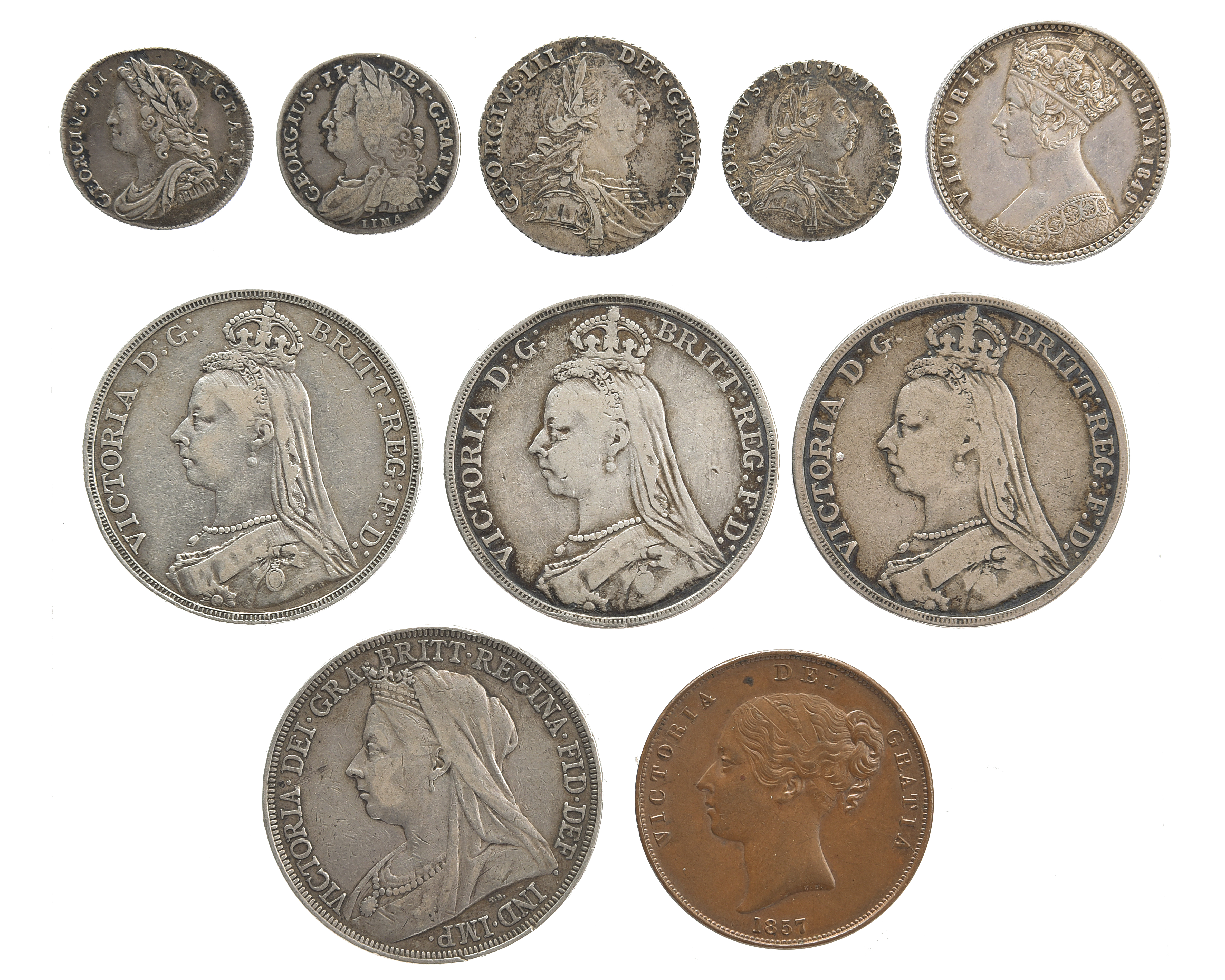 A quantity of Hanoverian and later coins, including: George II, silver sixpence, 1731, young bust, roses and plumes (S 3707), very fine or nearly so; silver sixpence, 1745, LIMA (S 3710), fine; George III, silver shilling, 1787, with semée of hearts (S 3746), very fine; silver sixpence, 1787, with semée of hearts (S 3749), very fine; Victoria, silver florin, 1849, 'godless' type (S 3890), very fine; silver crowns (3), 1889, 1891 and 1892, Jubilee issue (S 3921), the first very fine, the others nearly so; silver crown, 1896, veiled bust (S 3937), about very fine; copper penny, 1857 (S 3948), good very fine; and other coins, foreign and domestic, varying grades. [qty]