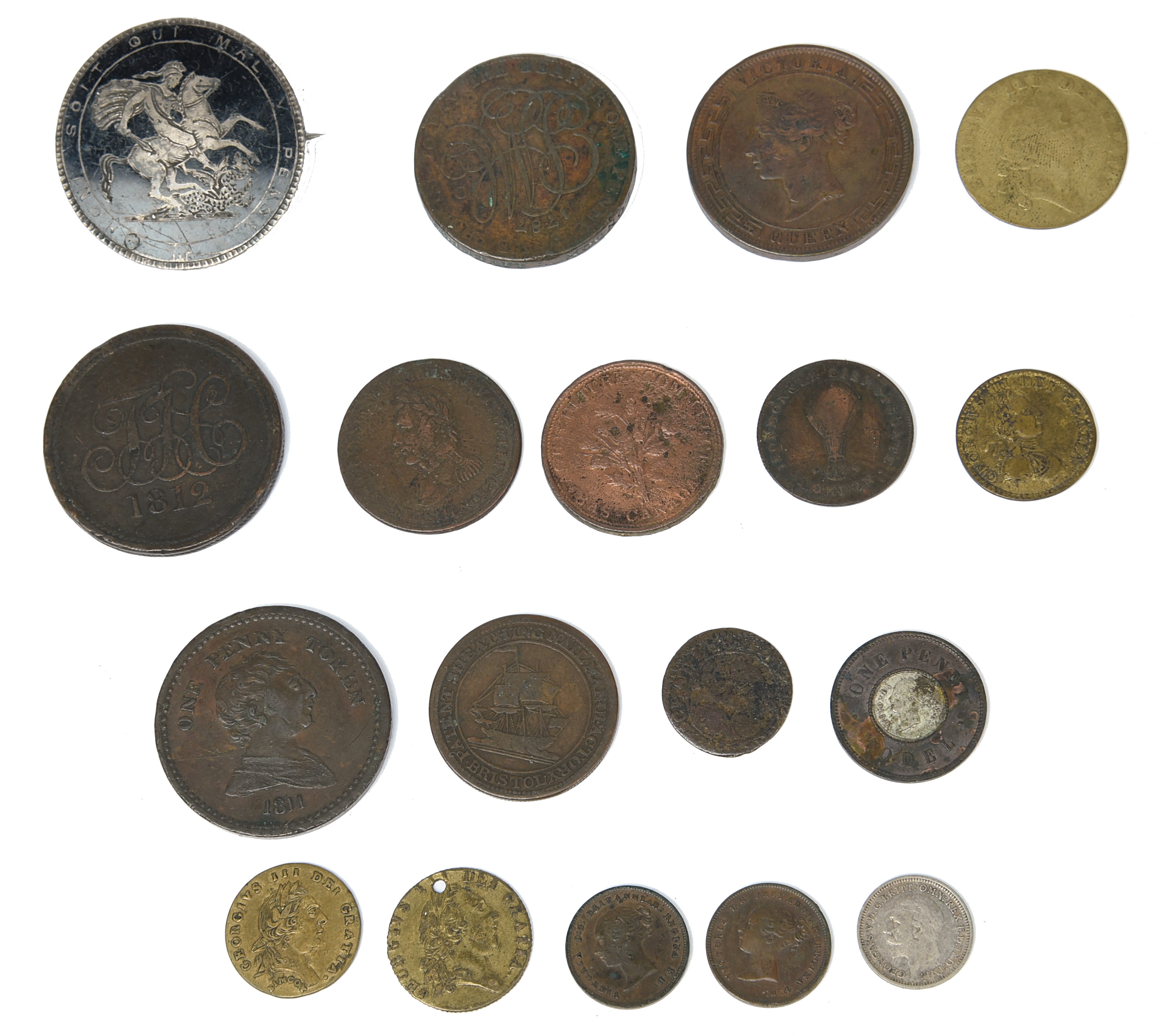 A small quantity of numismatic items, including a Bristol copper one penny token, 1811; other British token coins; Ceylon (British Colony), copper five cents, 1870, at least very fine; and other items. [qty]