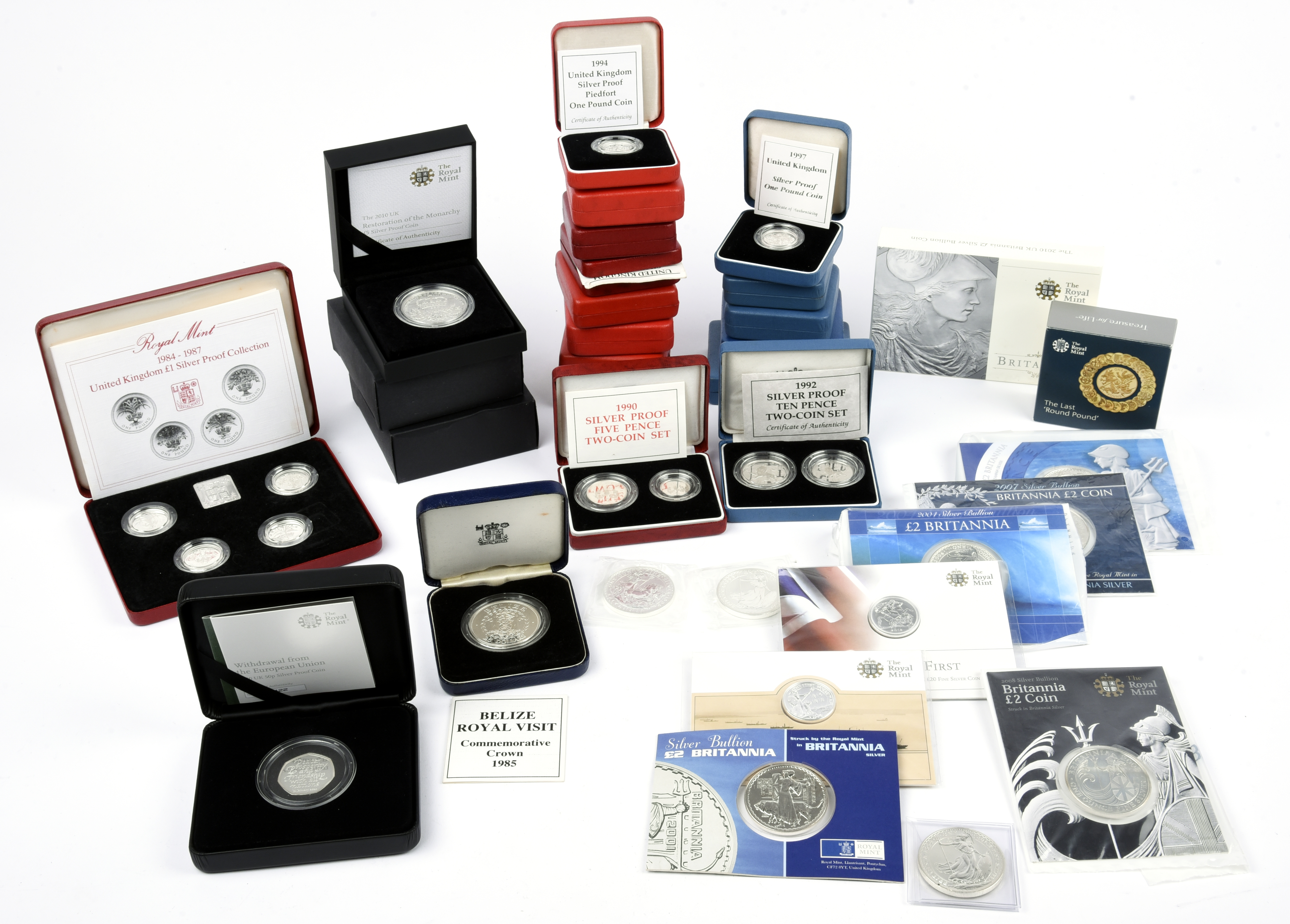 A collection of British silver proof and specimen coins, late 20th and 21st century, comprising: crown, 1977 Jubilee; Britannia five pounds (2), 2008, 2011; five pounds, 2010; two pounds (2), 1989 two-coin set; piedfort pounds (7), various dates; pounds (8), four being cased together in the 1984-87 set; fifty pence, 2020, withdrawal from the EU; ten pence (2), 1992 two-coin set; five pence (2), 1990 two-coin set; britannia two pounds (8), and pounds (2) various dates, in presentation envelopes; Belize royal visit commemorative crown, 1985; and a maundy set (4), 1957; mainly cased or in other original packaging, many with certificates, as struck or nearly so. [41]