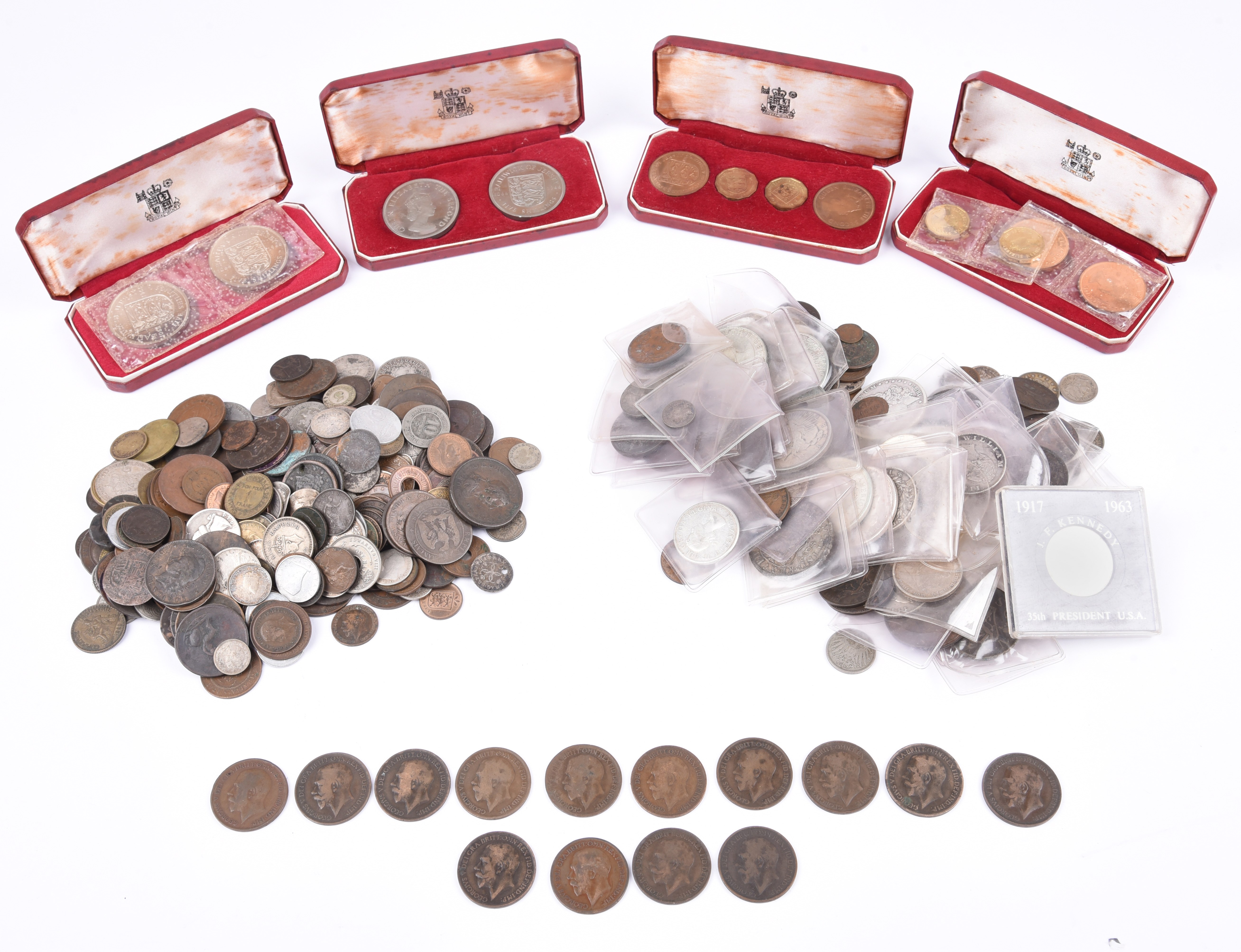 A large quantity of British and foreign coins, including, Heaton Mint and King's Norton pennies (14), all about fine; low denomination Georgian coins, low grades; channel islands issues including cased sets; British imperial issues; and other items.