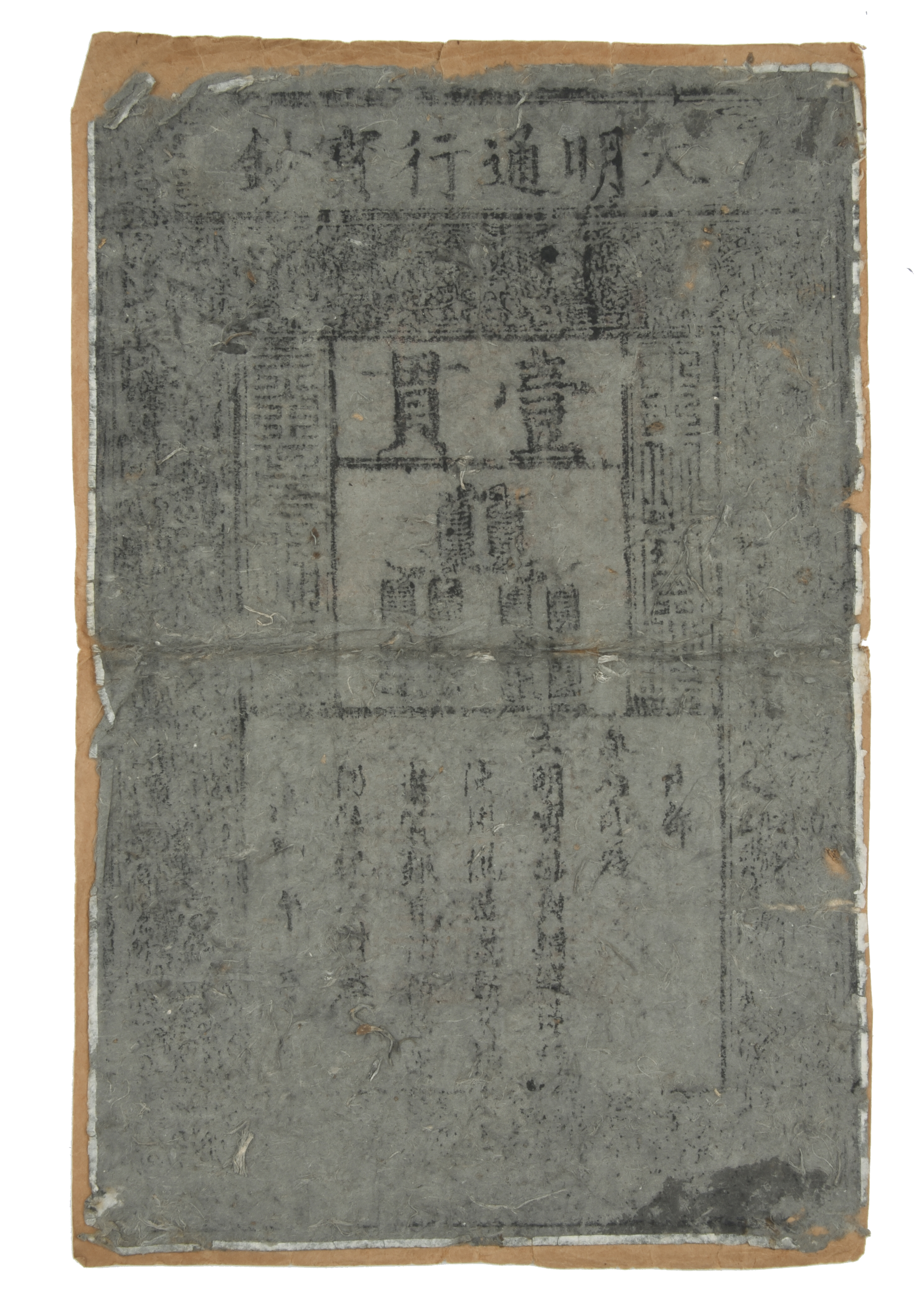 China: Ming Dynasty: one kuan, black print on grey mulberry (Pick AA10), stuck to backing paper, various scuffing, holes, thinning and edge damage.