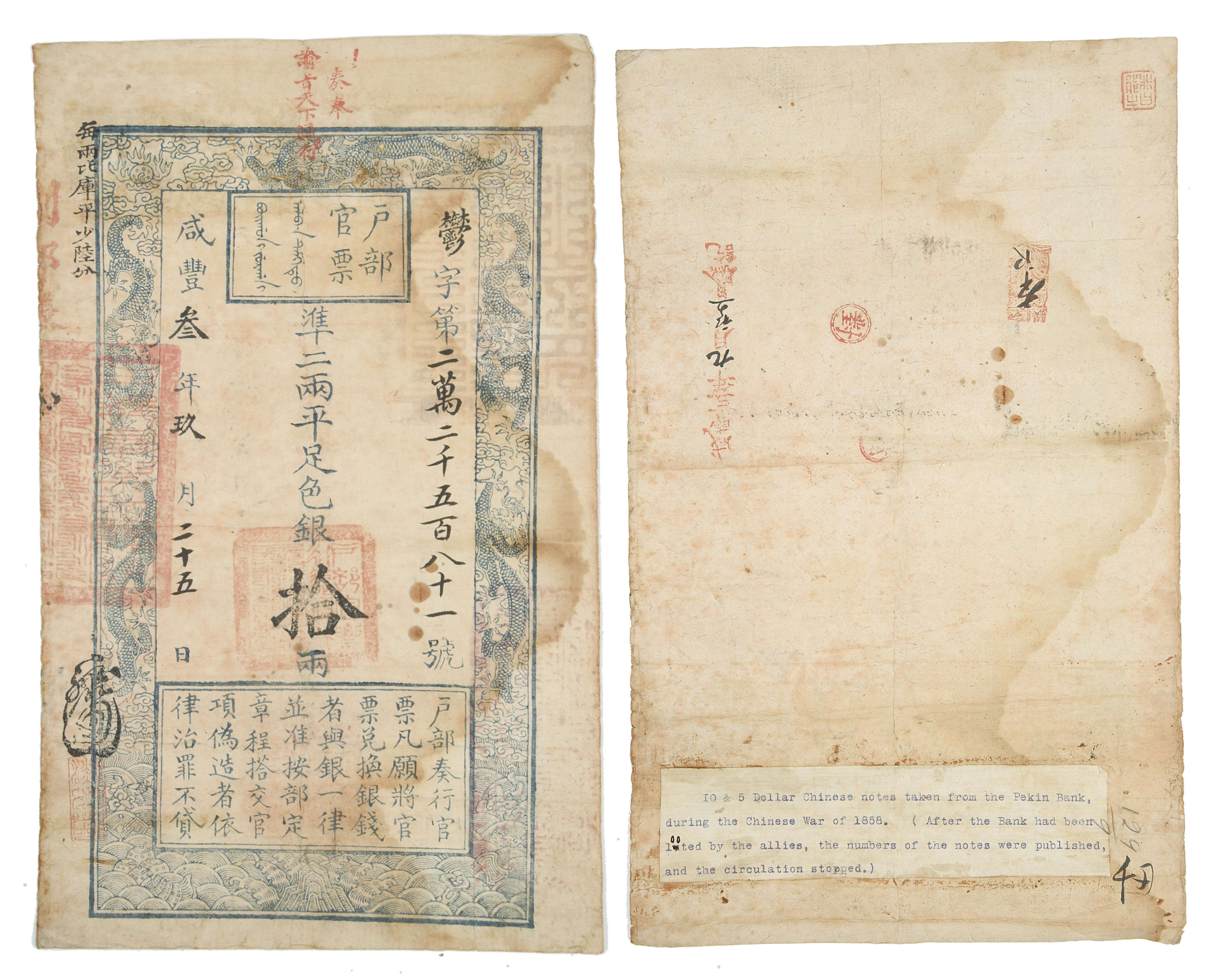 China: Qing Dynasty, a ten tael note, 1853, various endorsements to reverse, typed note pasted to reverse asserting that this and the following lot were "taken from the Pekin Bank, during the Chinese War of 1858" (Pick A12a), very good.
