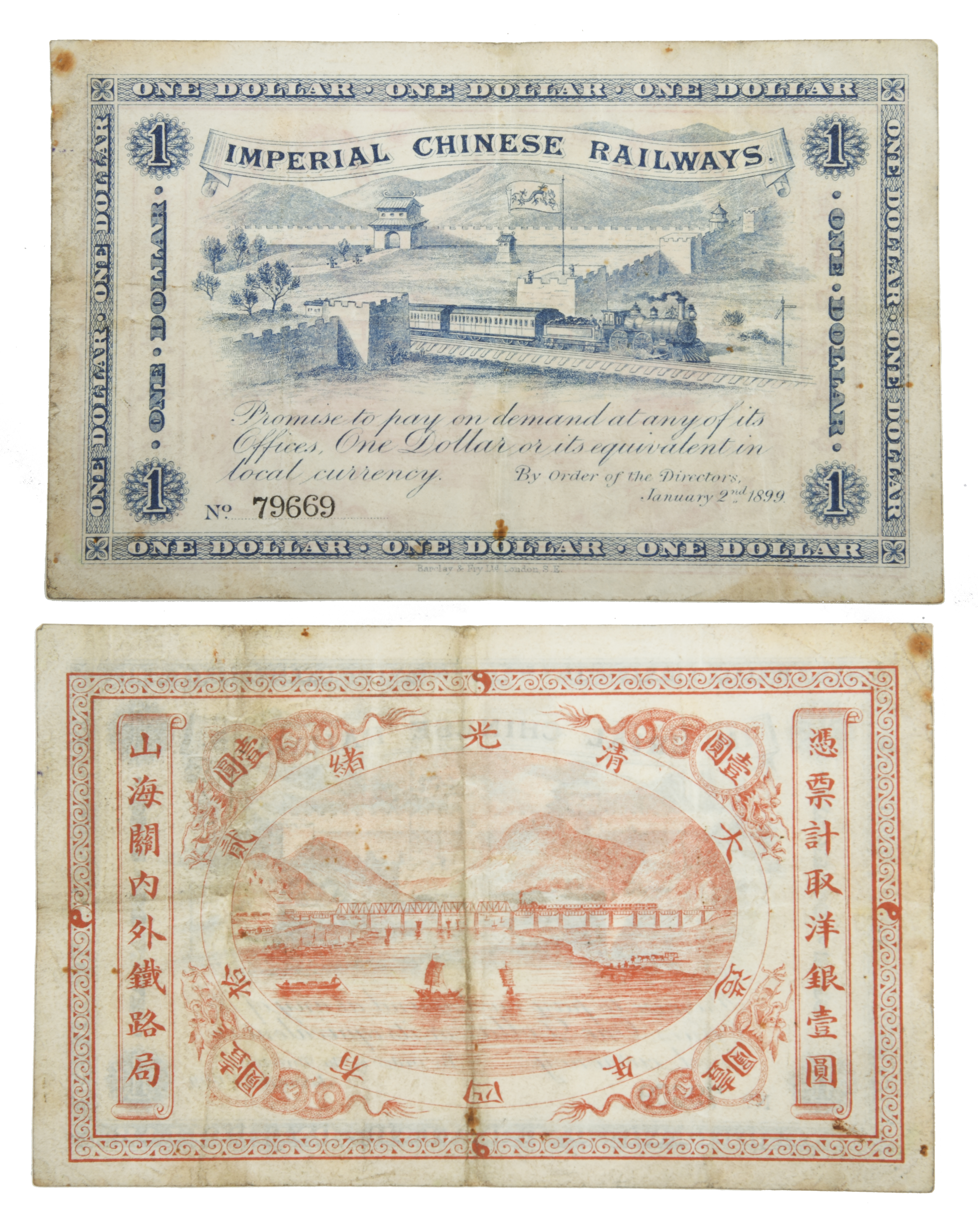 China: Qing Dynasty: Imperial Chinese Railways, dollar, January 2nd 1899, serial number 79669 (Pick A59), staple marks and some staining and folding, fine to very fine.
