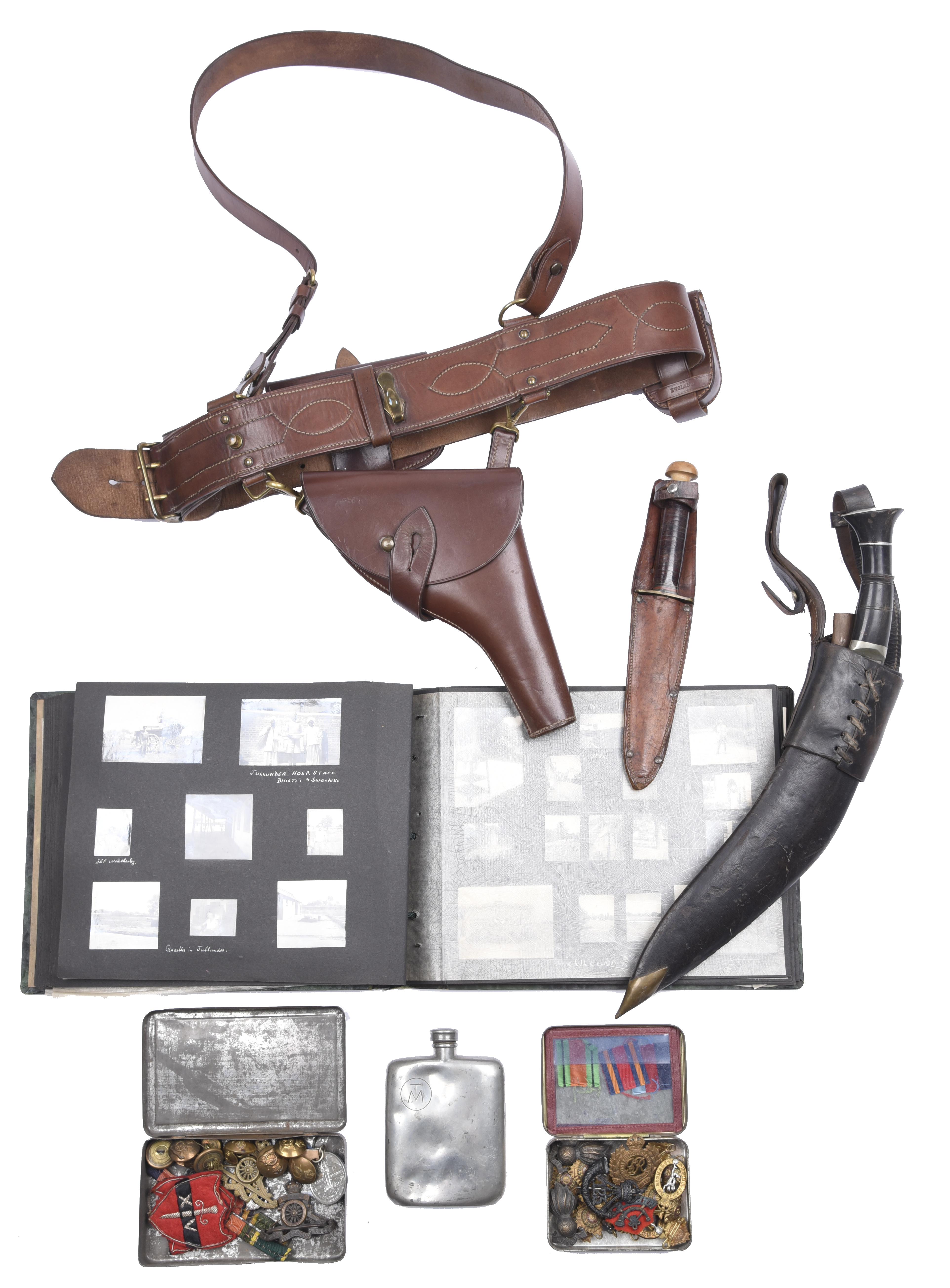 An interesting collection of militaria, representing the Second World War military career of Captain J.M. Tuke Morris, Royal Engineers int. al., who served with the artillery in the Burma campaign, including: his medal group of 1939-45 Star, Burma Star, Defence Medal and War Medal, in box of issue; a British officer's leather Sam Browne belt complete with revolver holster, pouch and compass pouch with 1939 dated marching compass; a kukri, in leather scabbard with one byknife; a small quantity of insignia including Royal Engineers, Royal Signals and 125 Light Infantry (India); documents and correspondence including service records and combat reports; and an album of photographs, military and topographical subjects, India in the 1940s. [qty]