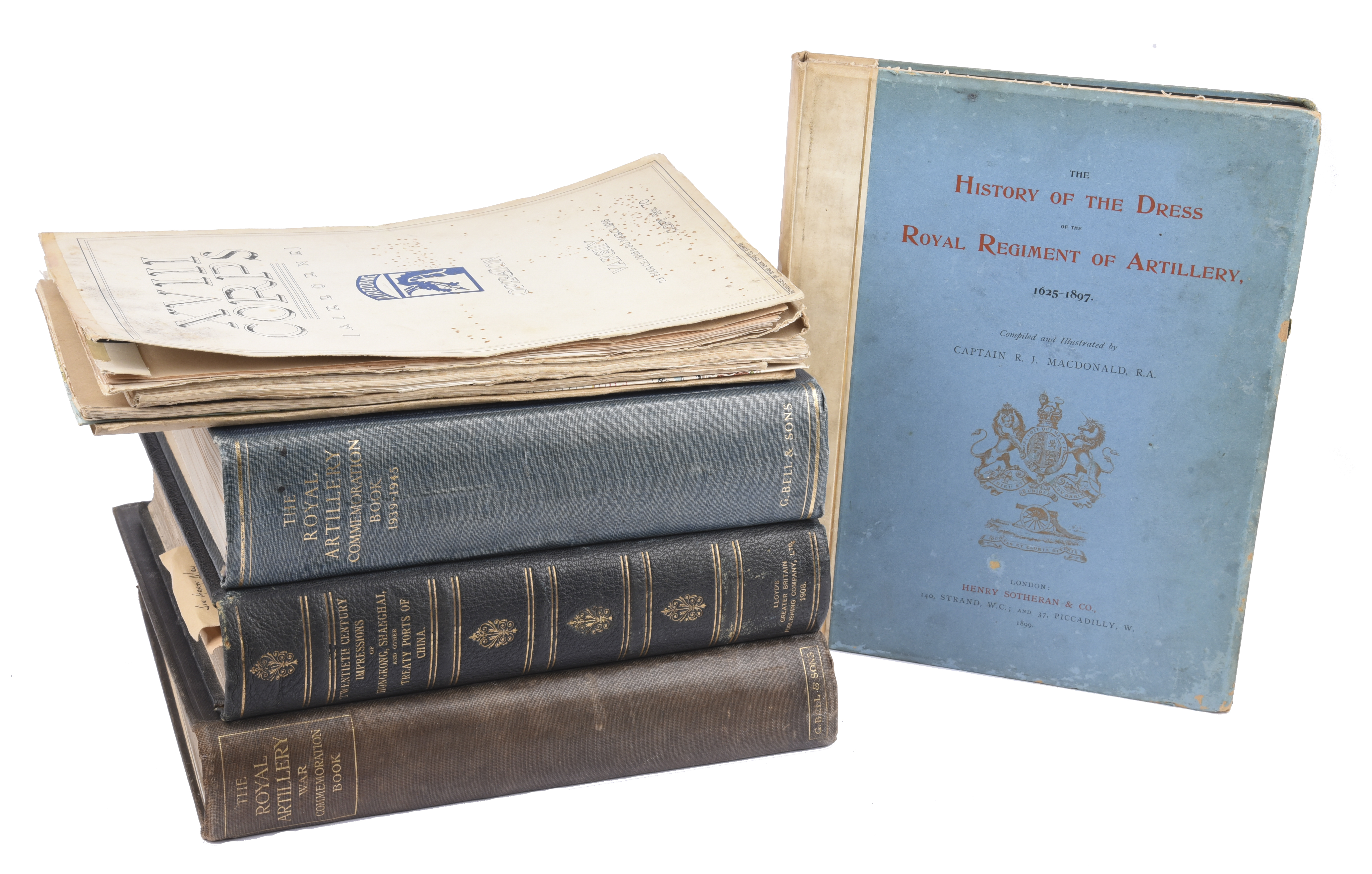A small quantity of books and bound journals, including: 'Twentieth Century Impressions of Hongkong, Shanghai, and other Treaty Ports of China'; 'The Royal Artillery Commemoration Book' (Great War); 'The Royal Artillery Commemoration Book 1939-45'; and other titles.