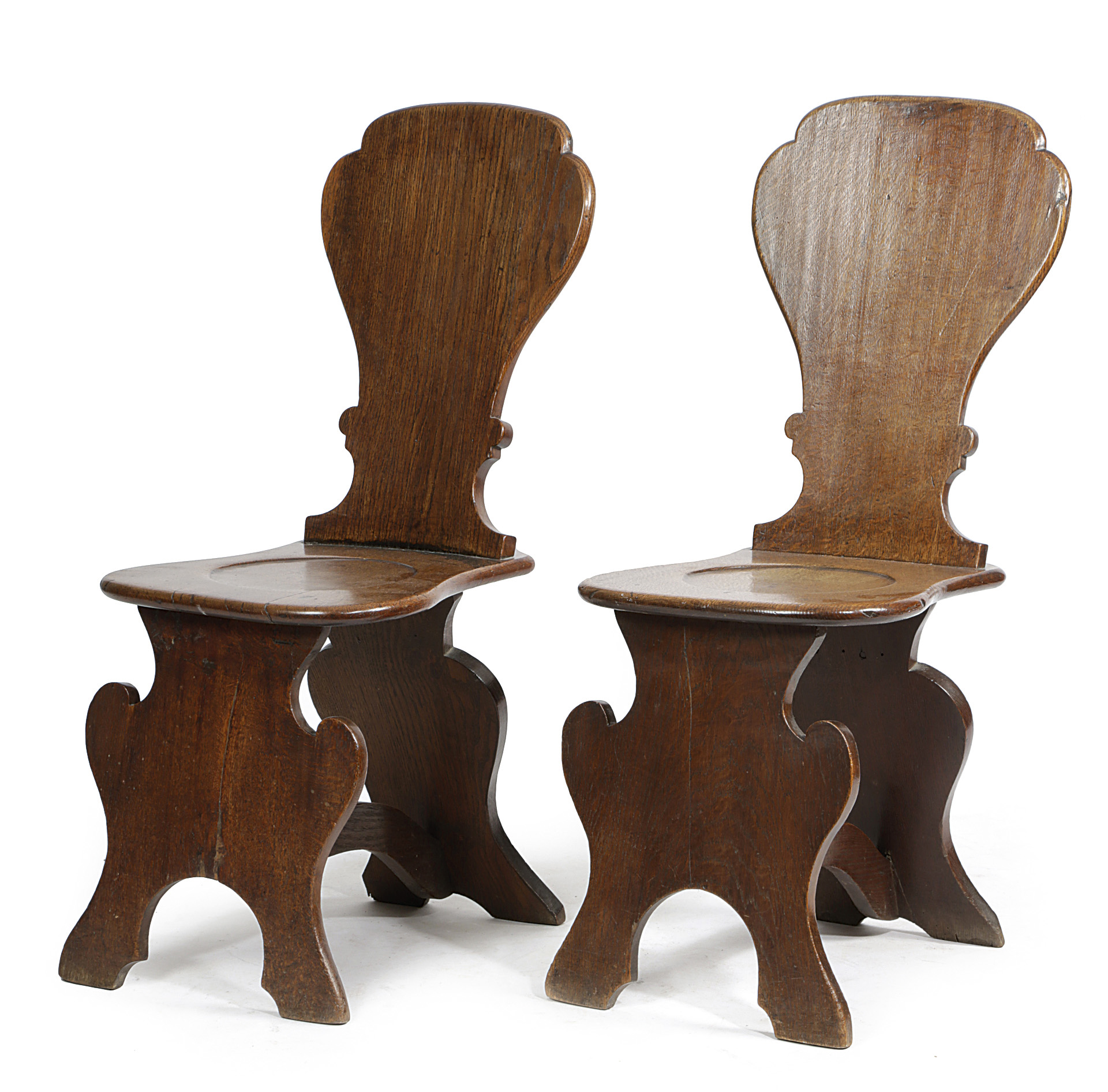 A NEAR PAIR OF GEORGE II OAK SGABELLO HALL CHAIRS